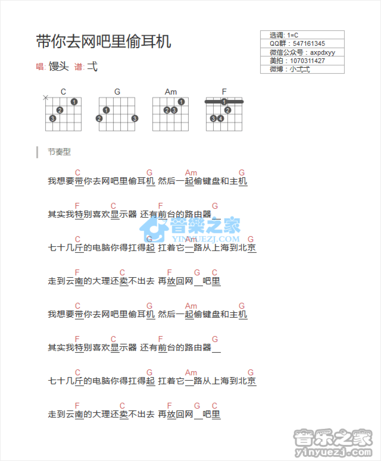 曲谱介绍: C调版 馒头《带你去网吧偷耳机》吉他和弦弹唱谱