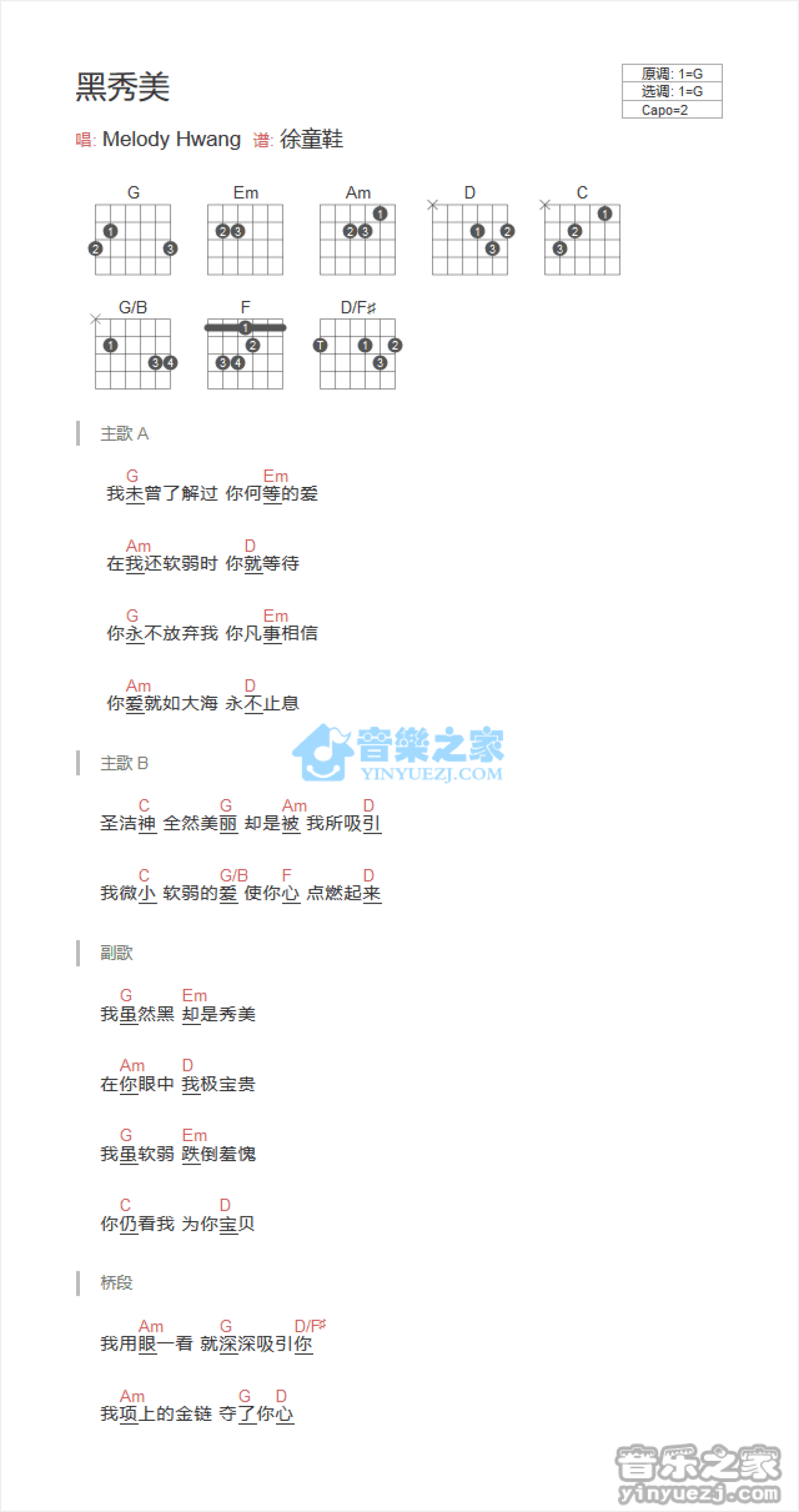 曲谱介绍: G调版 Melody Hwang《黑秀美》吉他和弦弹唱谱