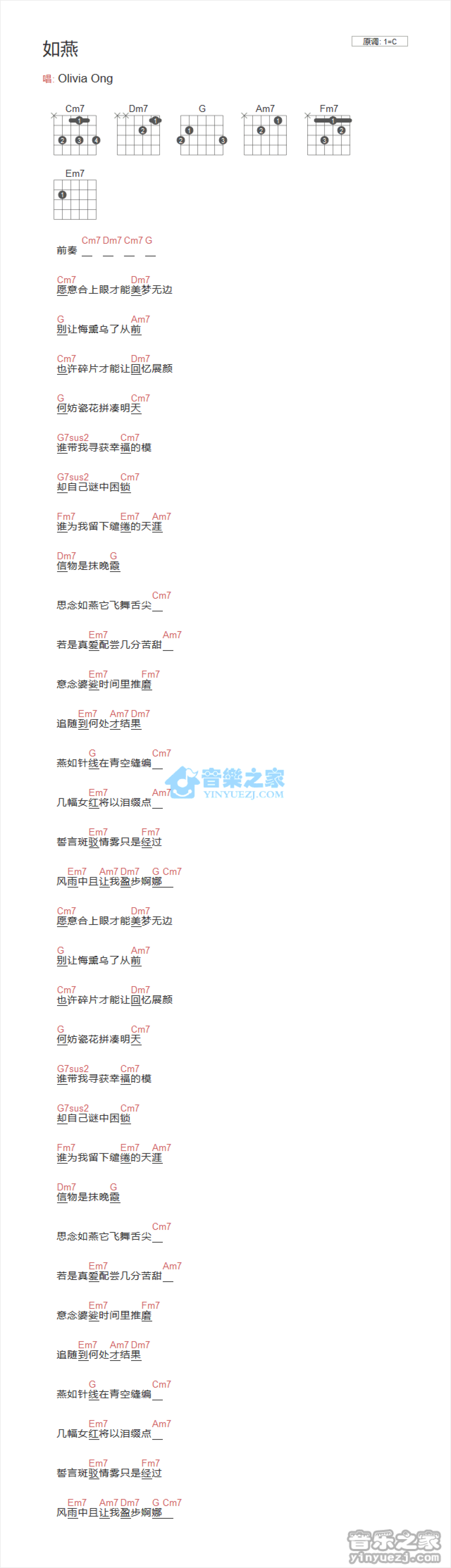 曲谱介绍: C调版 Olivia Ong《如燕》吉他和弦弹唱谱