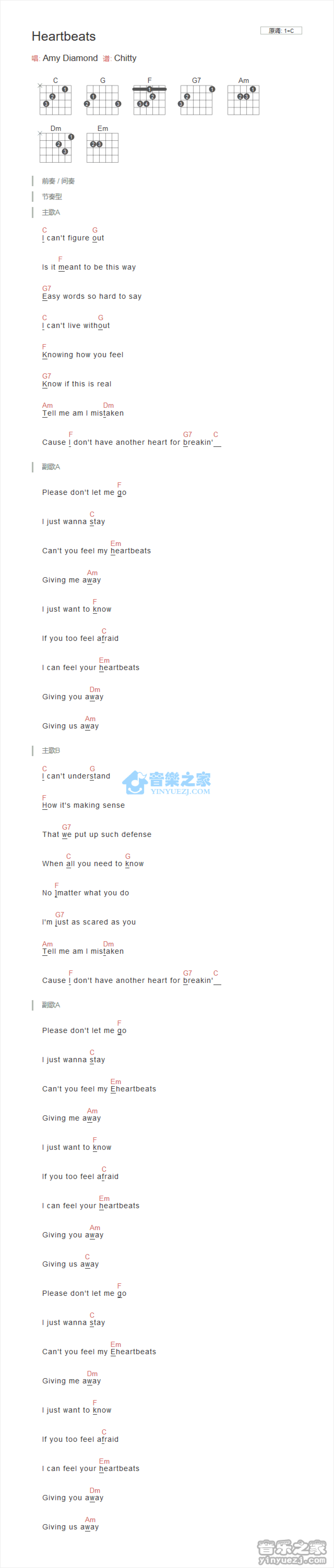 曲谱介绍: C调版 Amy Diamond《Heartbeats》吉他和弦弹唱谱