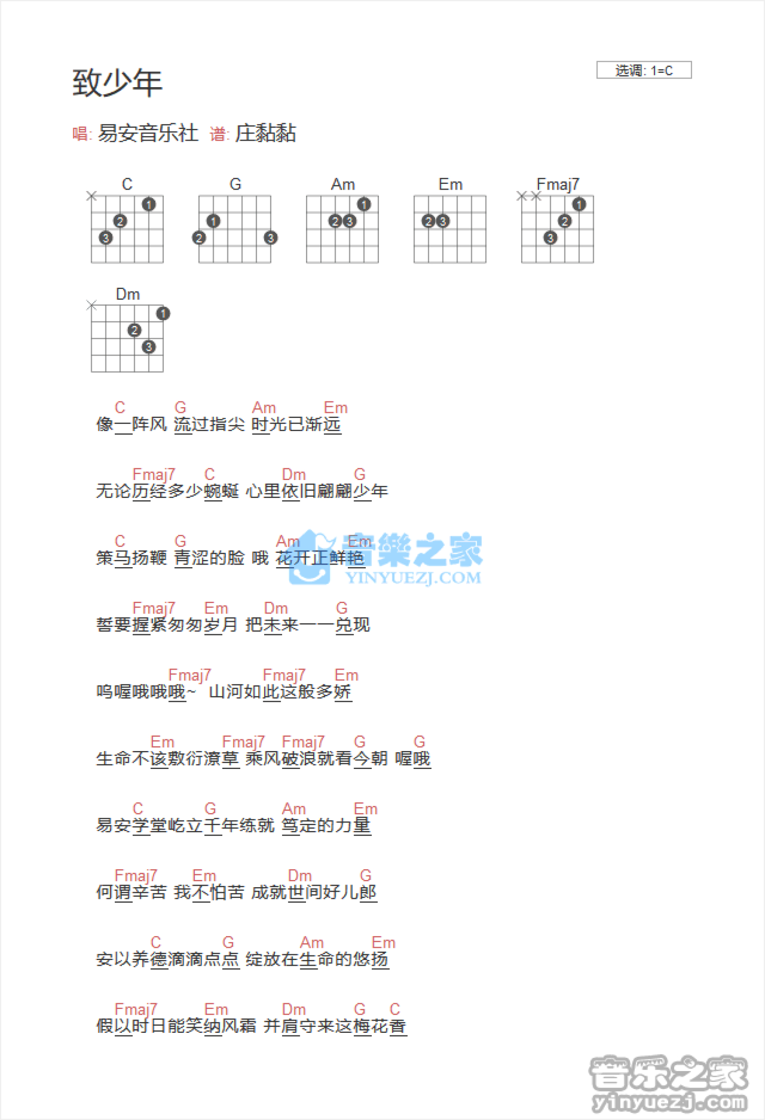 曲谱介绍: C调版 易安音乐社《至少年》吉他和弦弹唱谱