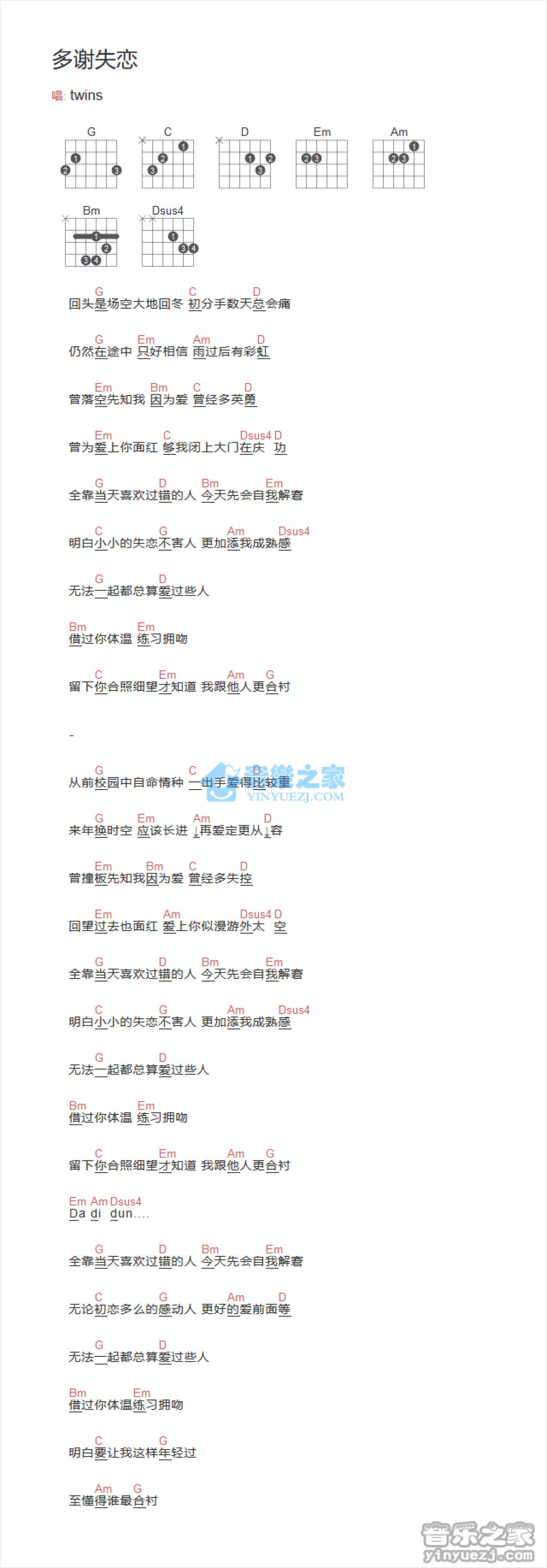 多谢失恋吉他谱 - Twins - G调吉他弹唱谱 - 和弦谱