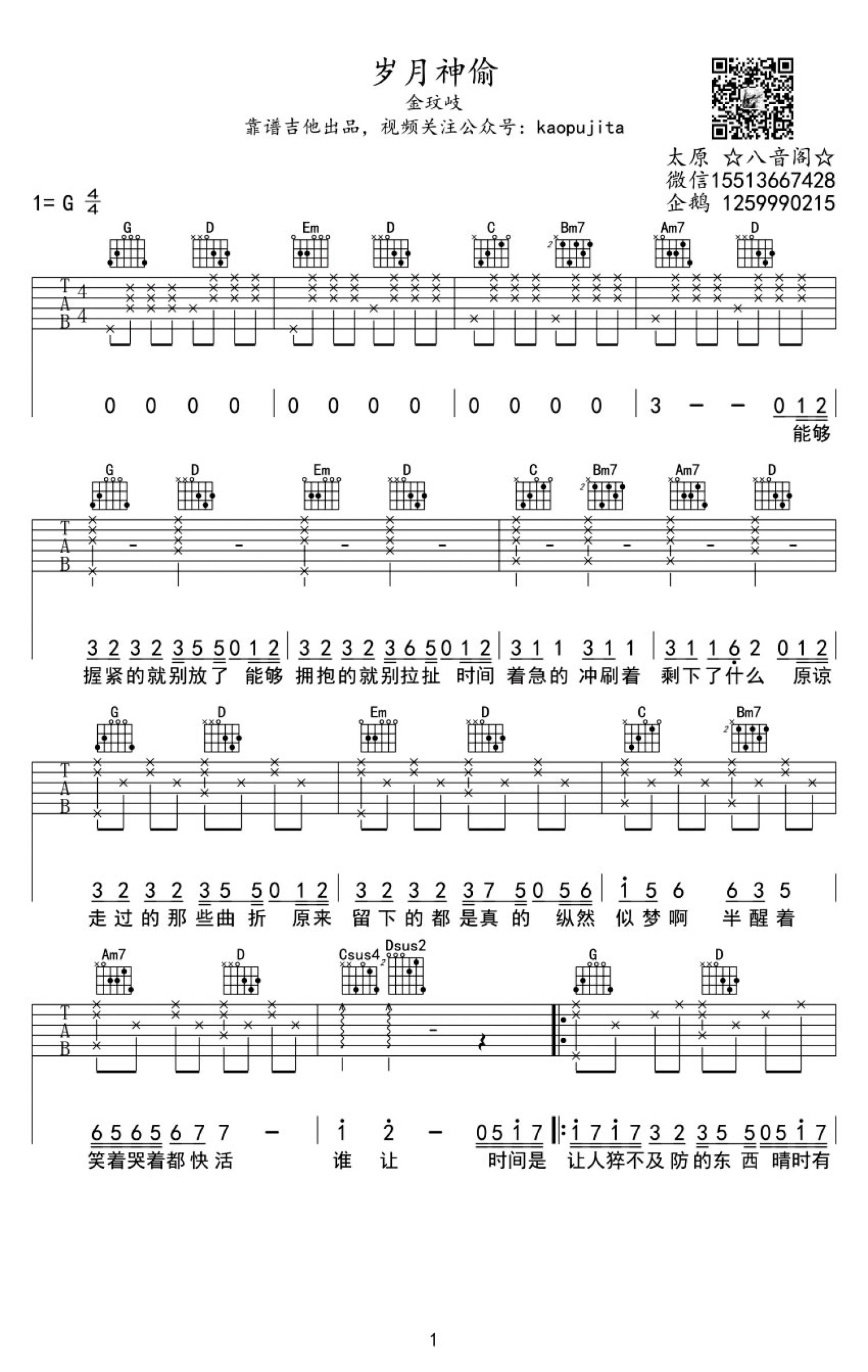 岁月神偷吉他谱 - 金玟岐 - G调吉他弹唱谱