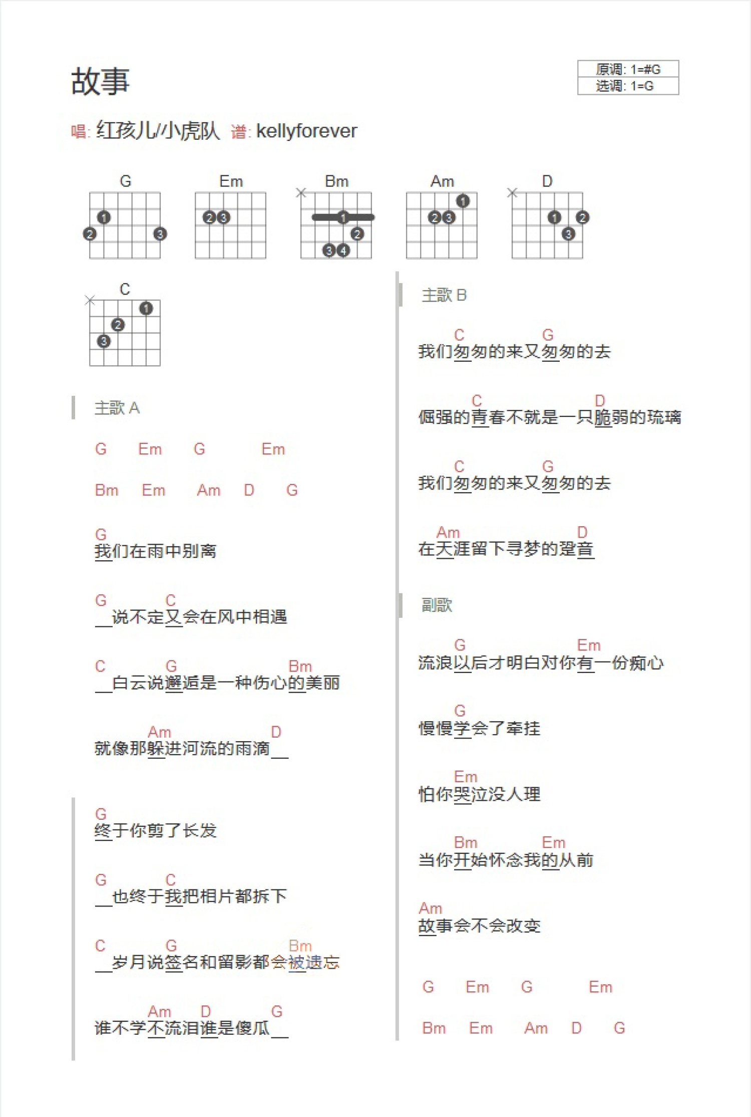 曲谱介绍: G调版 红孩儿/小虎队《故事》吉他和弦弹唱谱