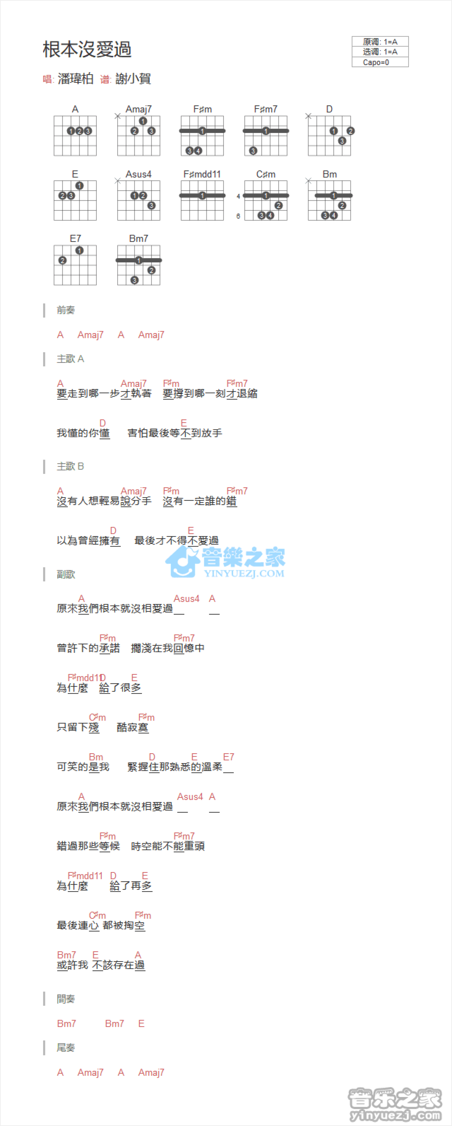 根本没爱过吉他谱 - 潘玮柏 - A调吉他弹唱谱 - 和弦谱