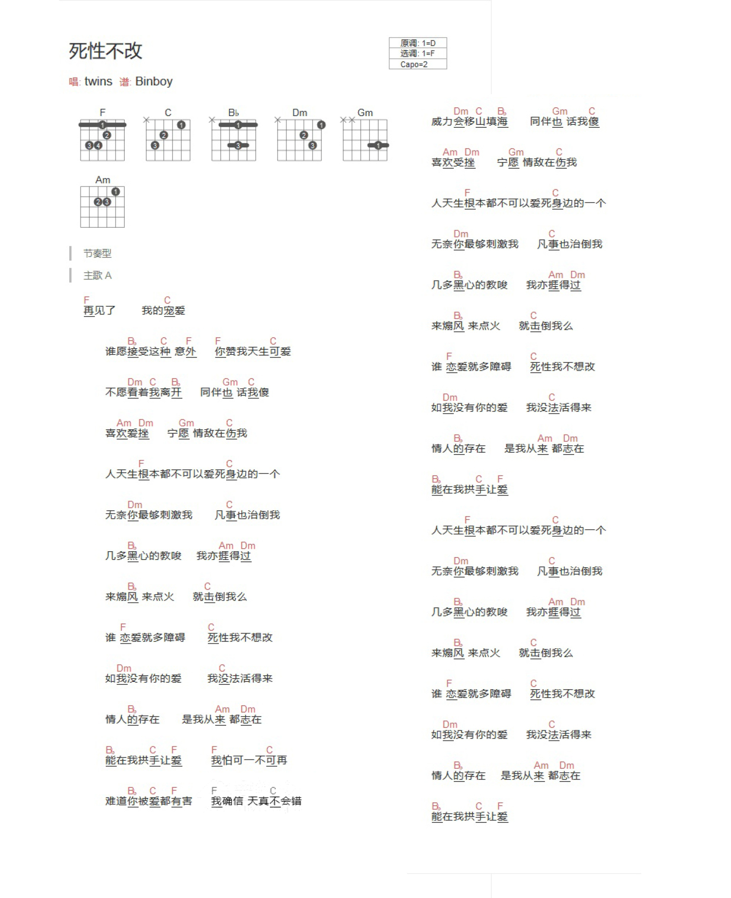 曲谱介绍: F调版 Twins《死性不改》吉他和弦弹唱谱