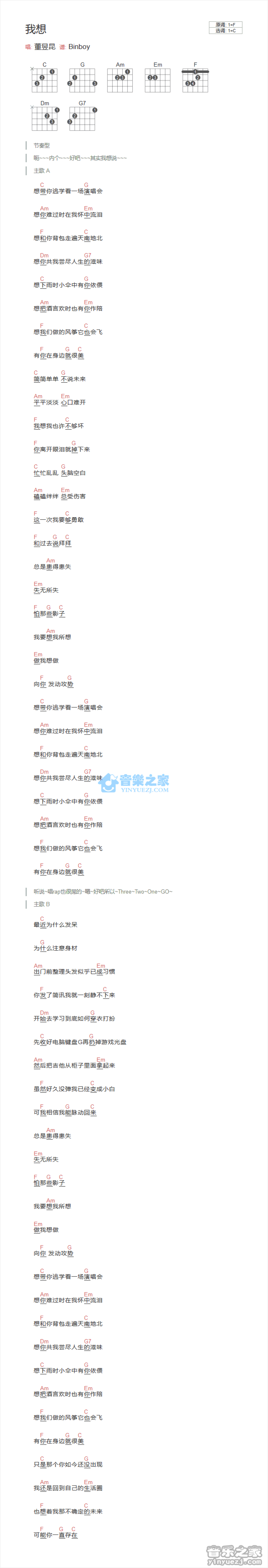 曲谱介绍: C调版 董昱坤《我想》吉他和弦弹唱谱