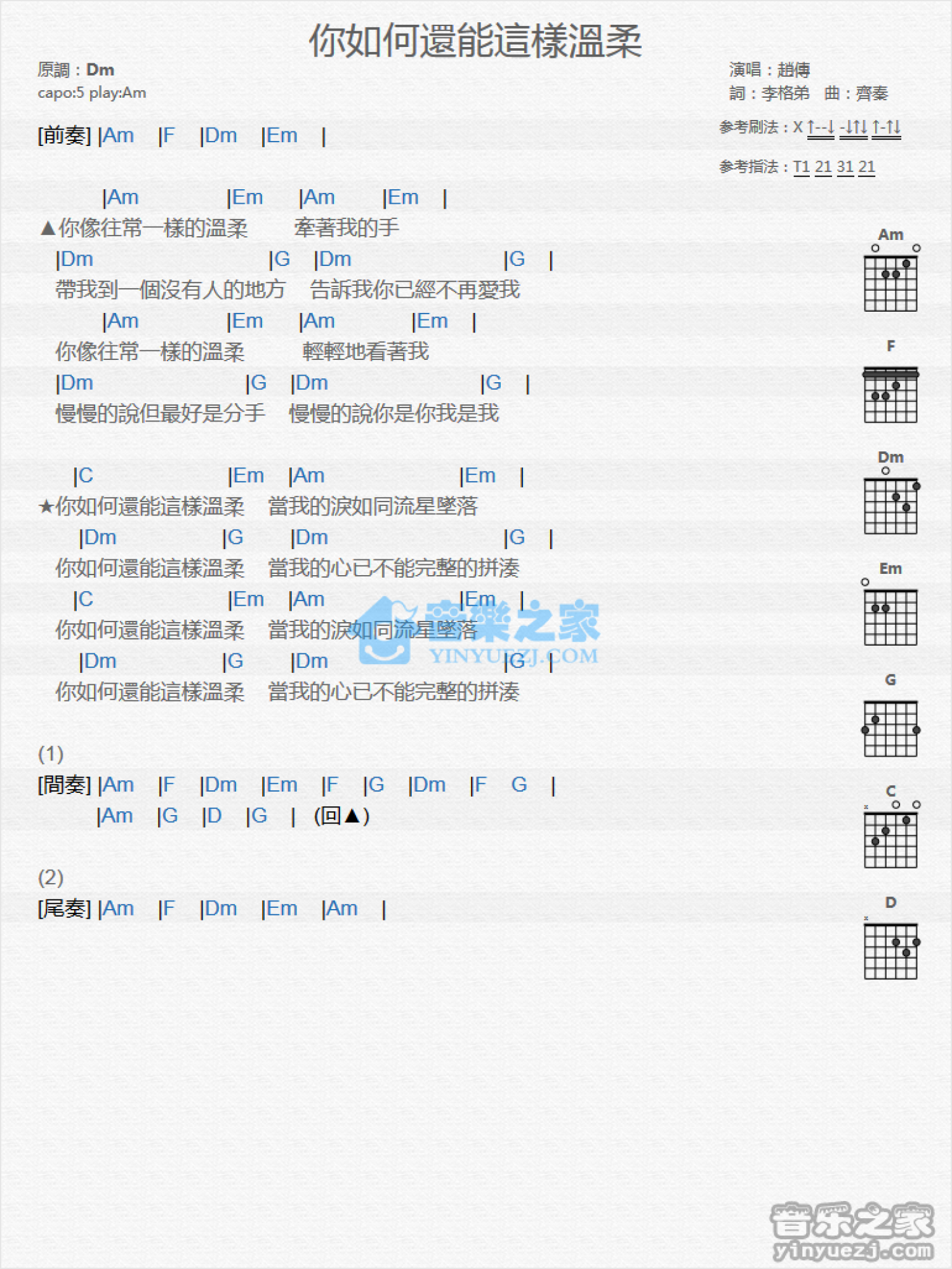 曲谱介绍: Am调版 赵传《你如何还能这样温柔》吉他和弦弹唱谱
