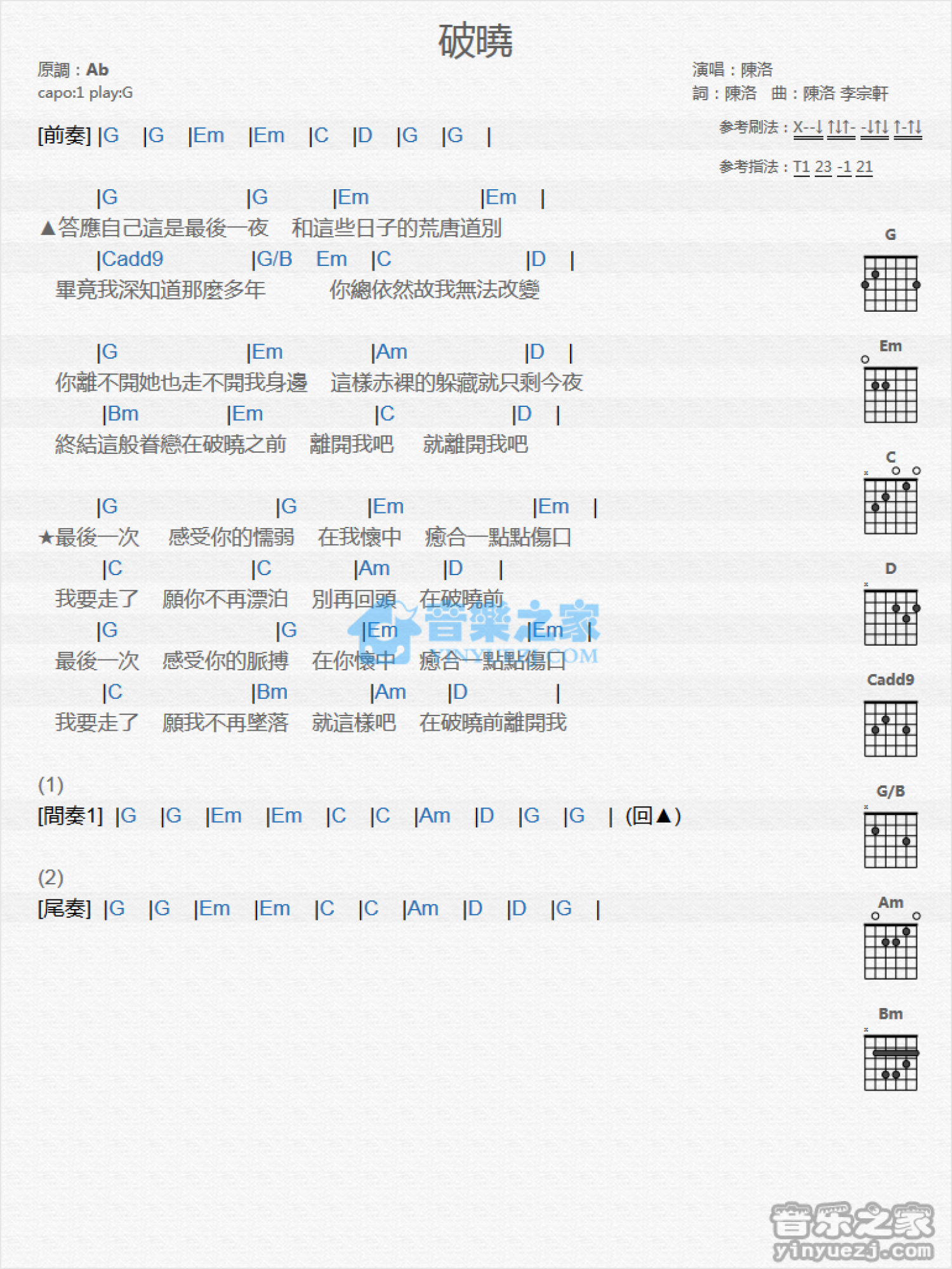 曲谱介绍: G调版 陈洛《破晓》吉他和弦弹唱谱