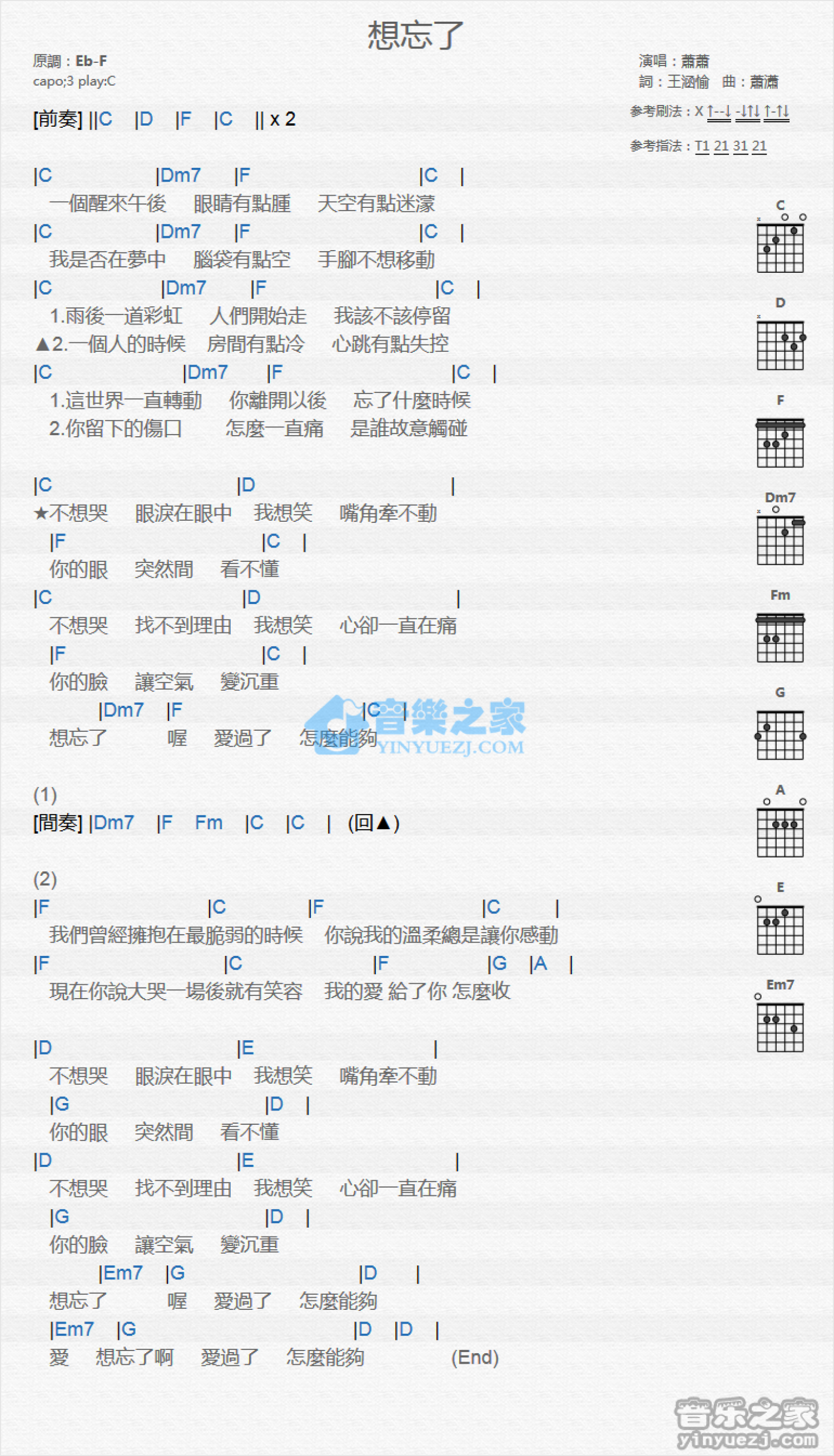 曲谱介绍: C调版 萧萧《想忘了》吉他和弦弹唱谱