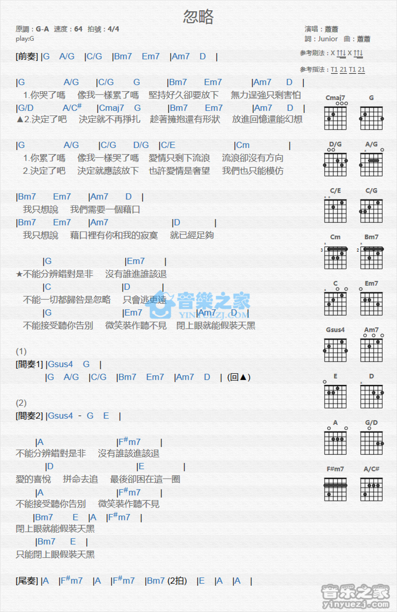 曲谱介绍: G调版 萧萧《忽略》吉他和弦弹唱谱