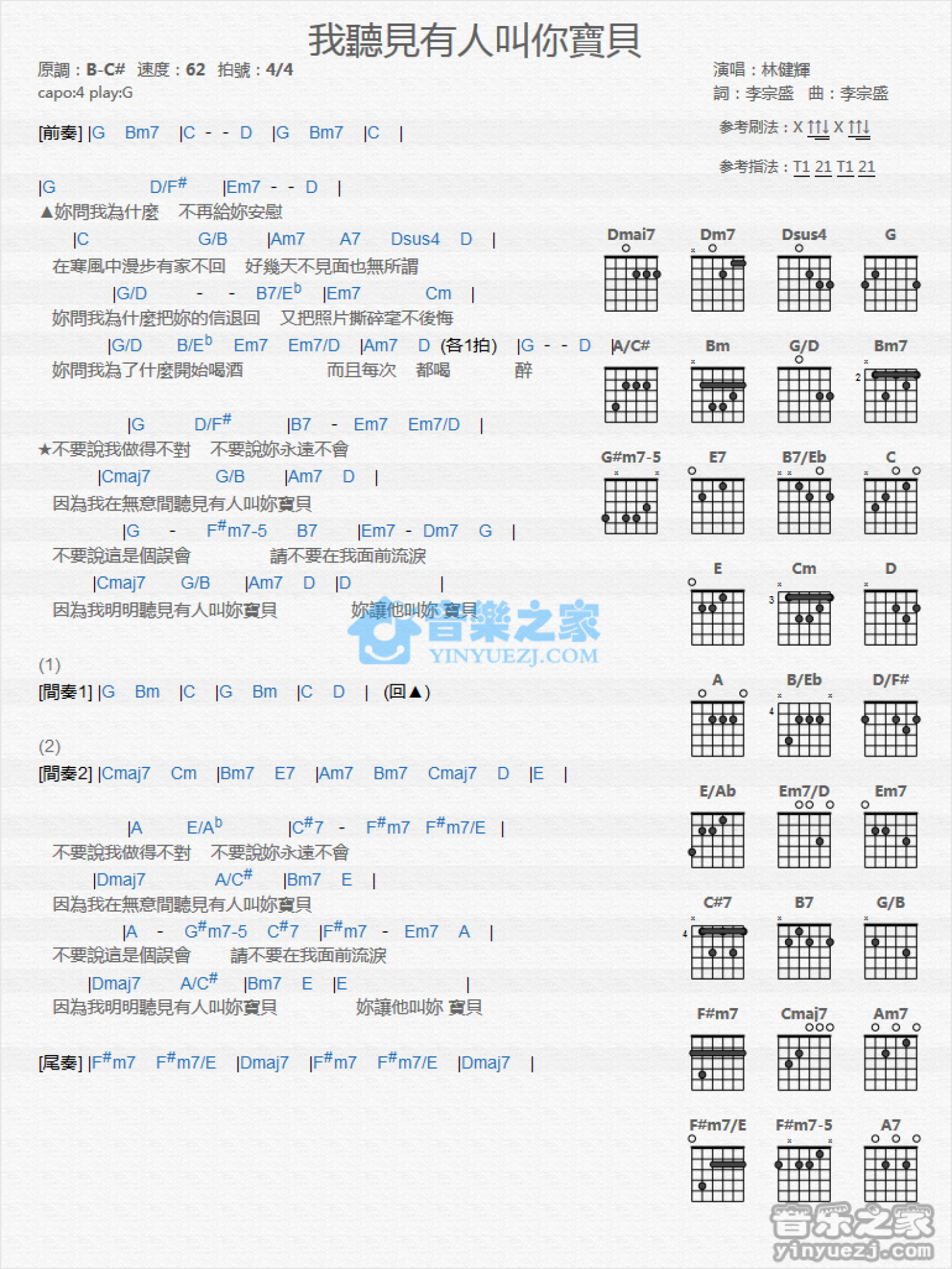 曲谱介绍: G调版 林健辉《我听见有人叫你宝贝》吉他和弦弹唱谱