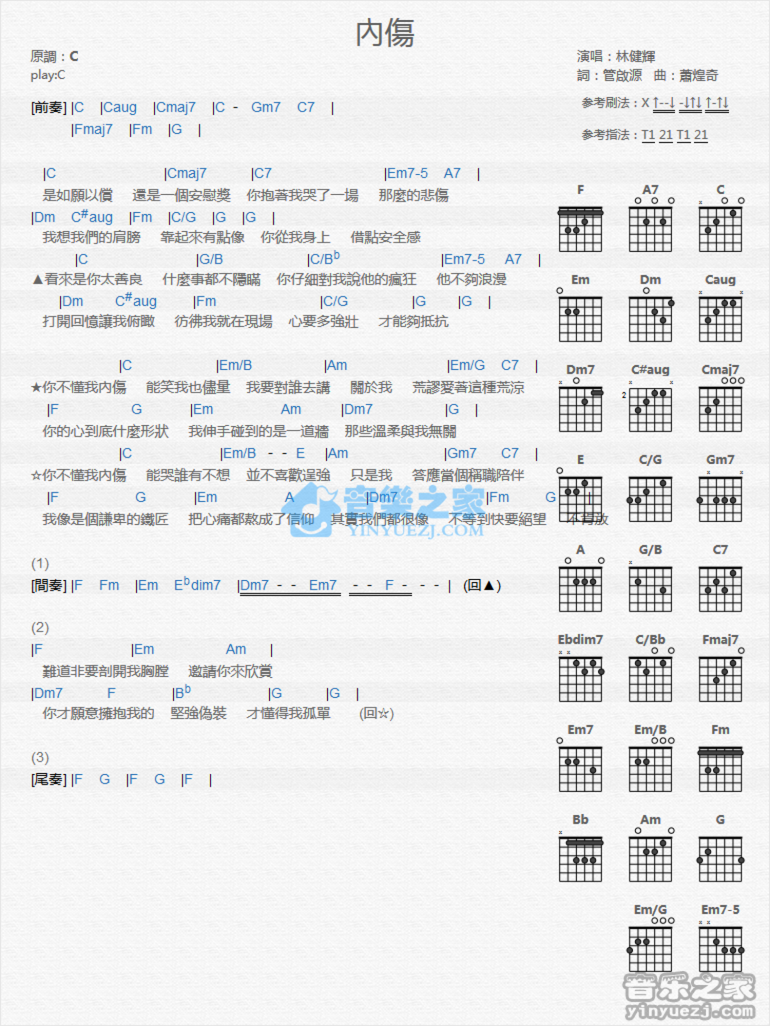 曲谱介绍: C调版林健辉《内伤》吉他和弦弹唱谱