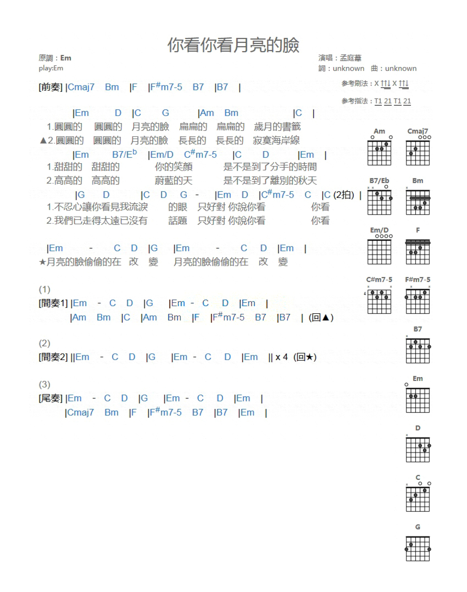 你看你看月亮的脸吉他谱 - 孟庭苇 - E调吉他弹唱谱 - 和弦谱