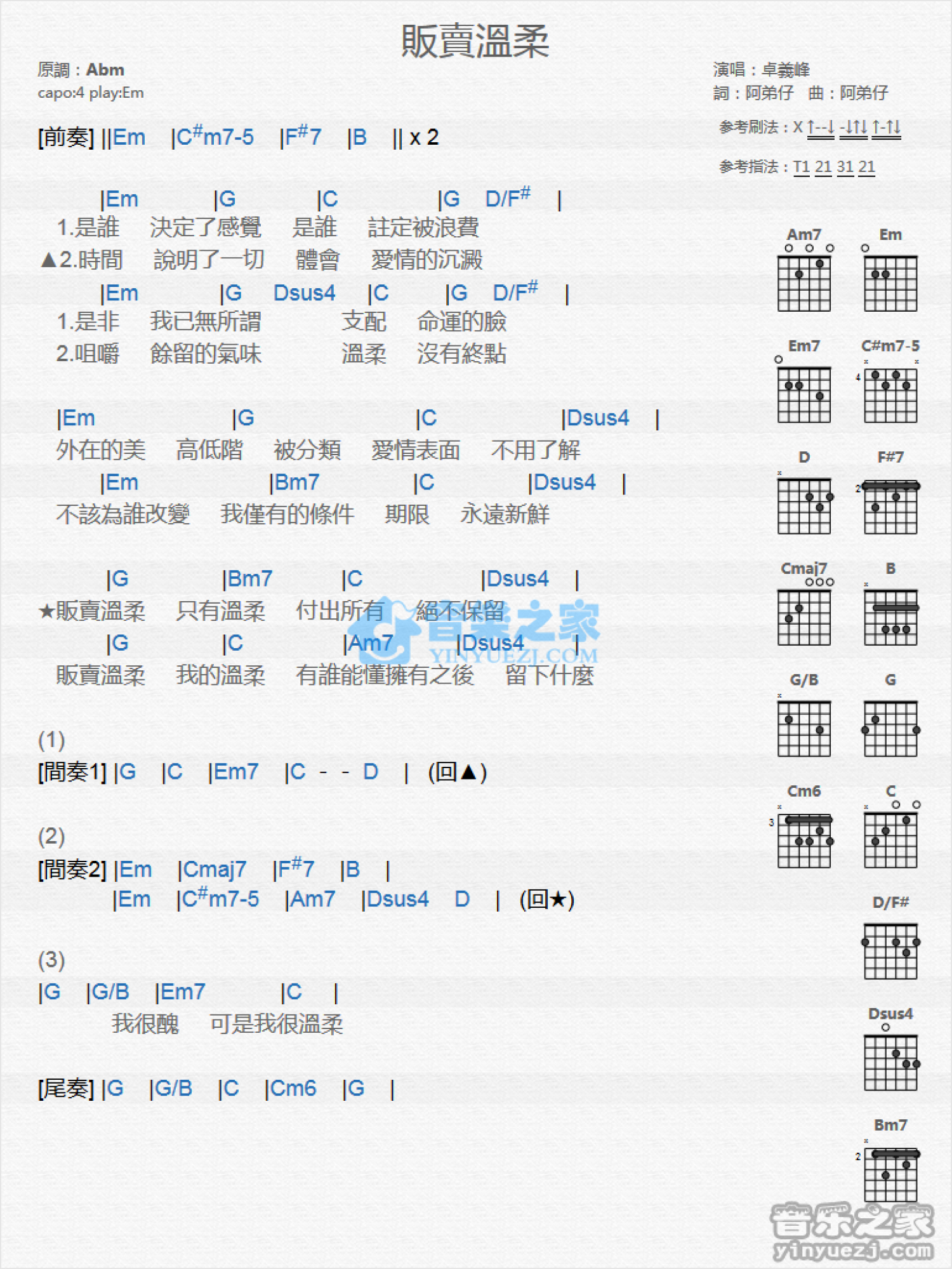 曲谱介绍: Em调版 卓义峰《贩卖温柔》吉他和弦弹唱谱