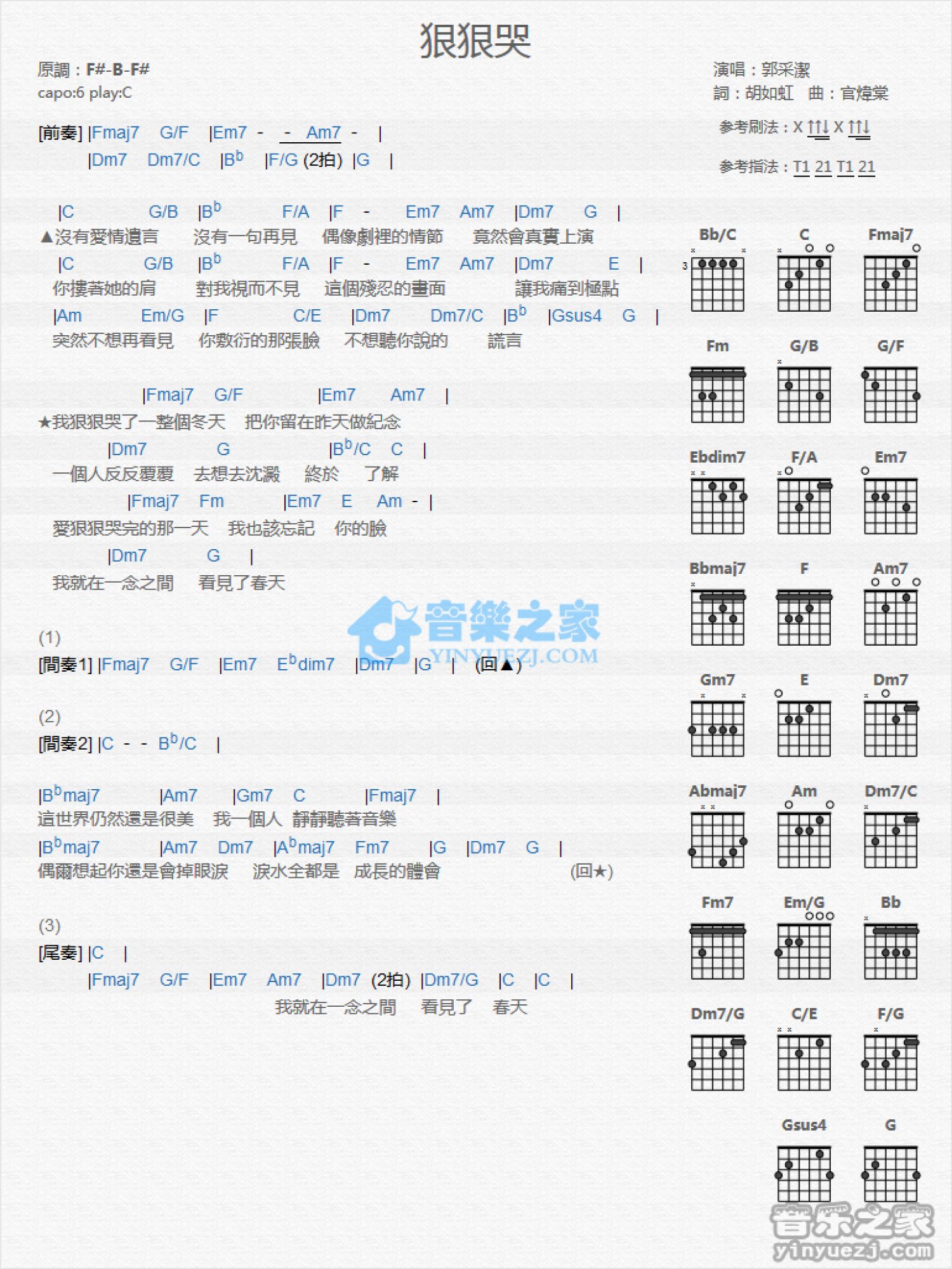 曲谱介绍: C调版 郭采洁《狠狠哭》吉他和弦弹唱谱