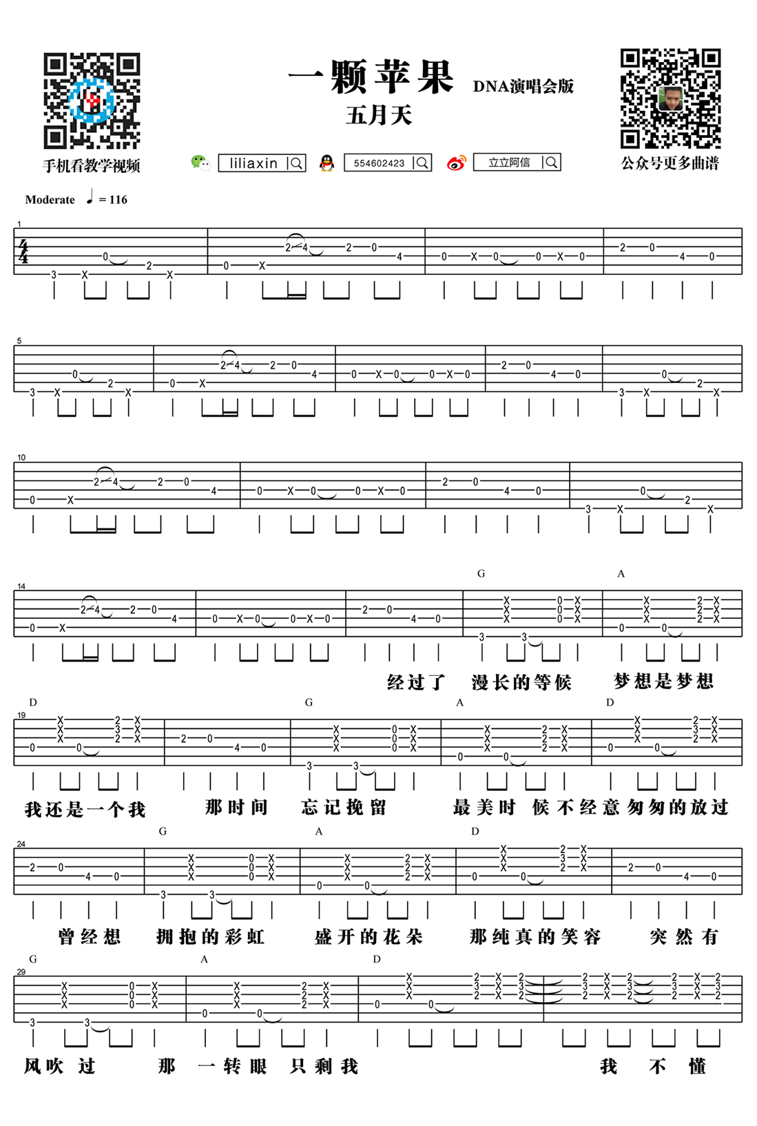 曲谱介绍: 五月天一颗苹果吉他谱,改编自DNA小巨蛋live演唱会版本,分享并提供《一颗苹果》吉他弹唱教学视频。生活就是这样,再吃一颗苹果。幸福就这么简单,只要努力过,即使没有成功也要给自己一个微笑!