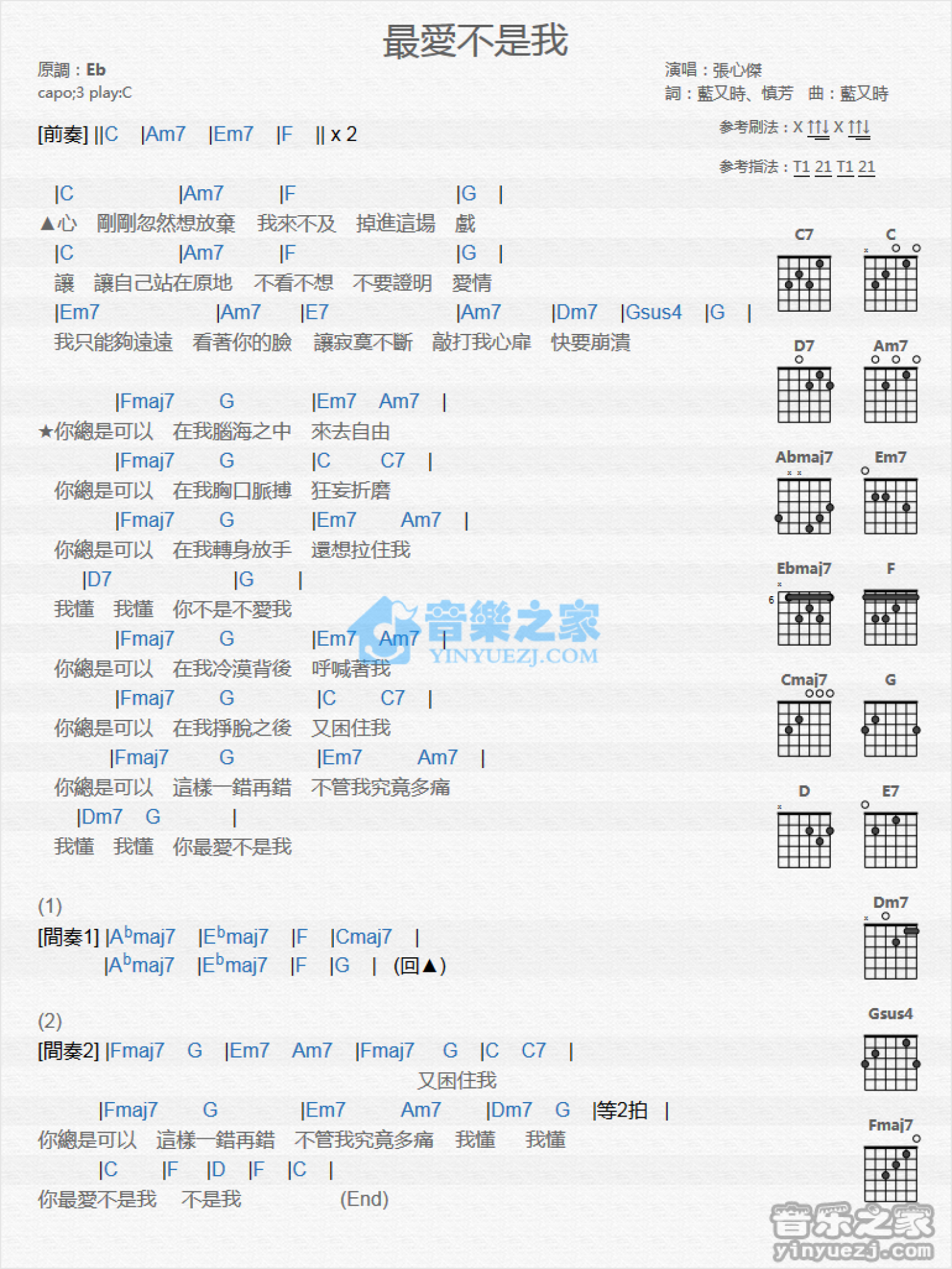 曲谱介绍: C调版 张心杰《最爱不是我》吉他和弦弹唱谱