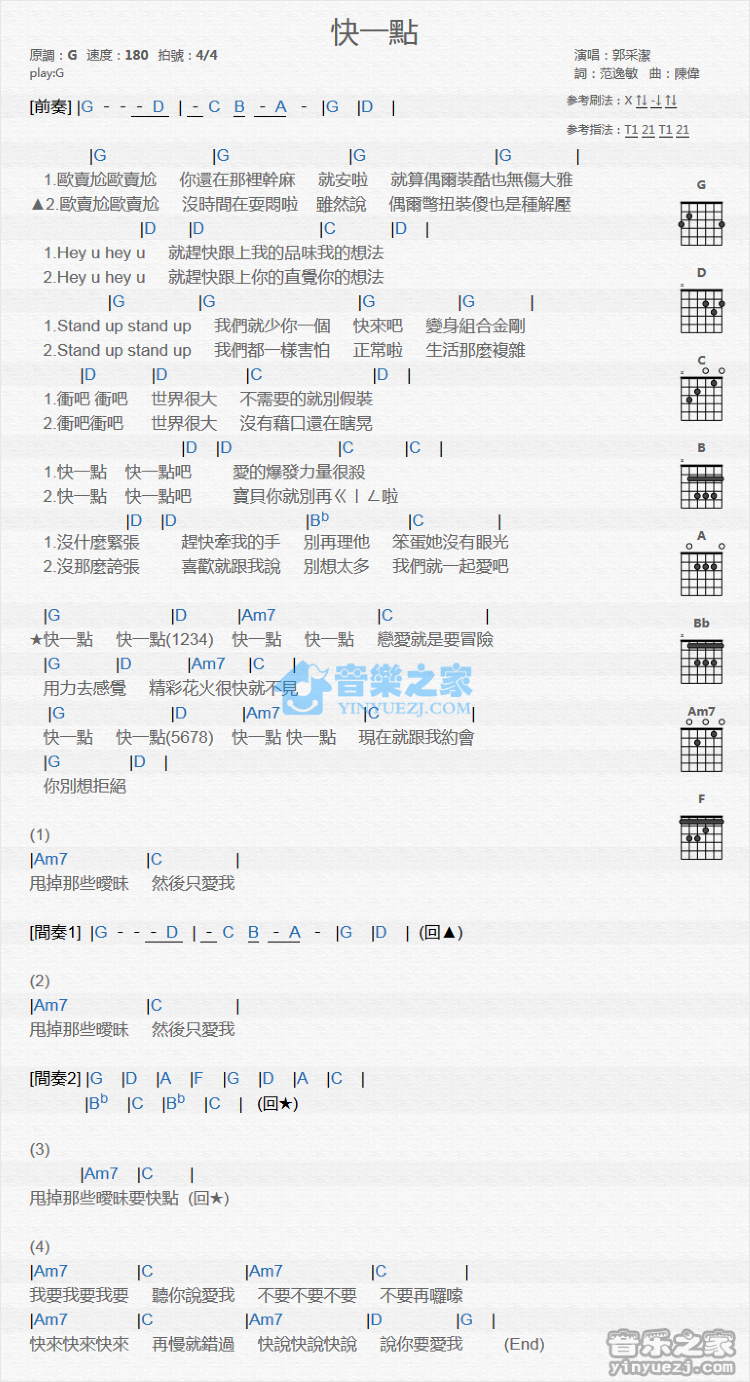 曲谱介绍: G调版 郭采洁《快一点》吉他和弦弹唱谱