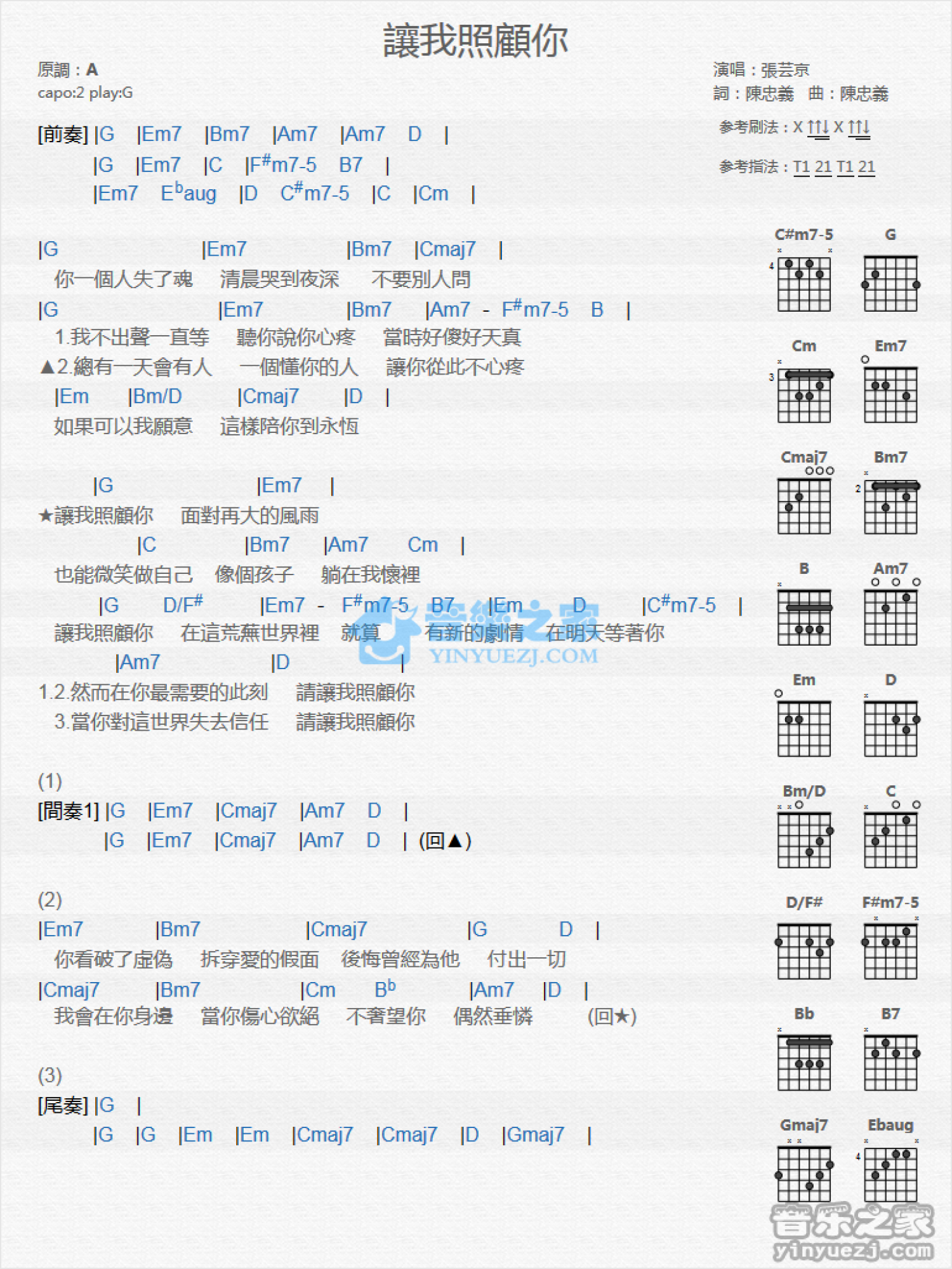 曲谱介绍: G调版 张芸京《让我照顾你》吉他和弦弹唱谱
