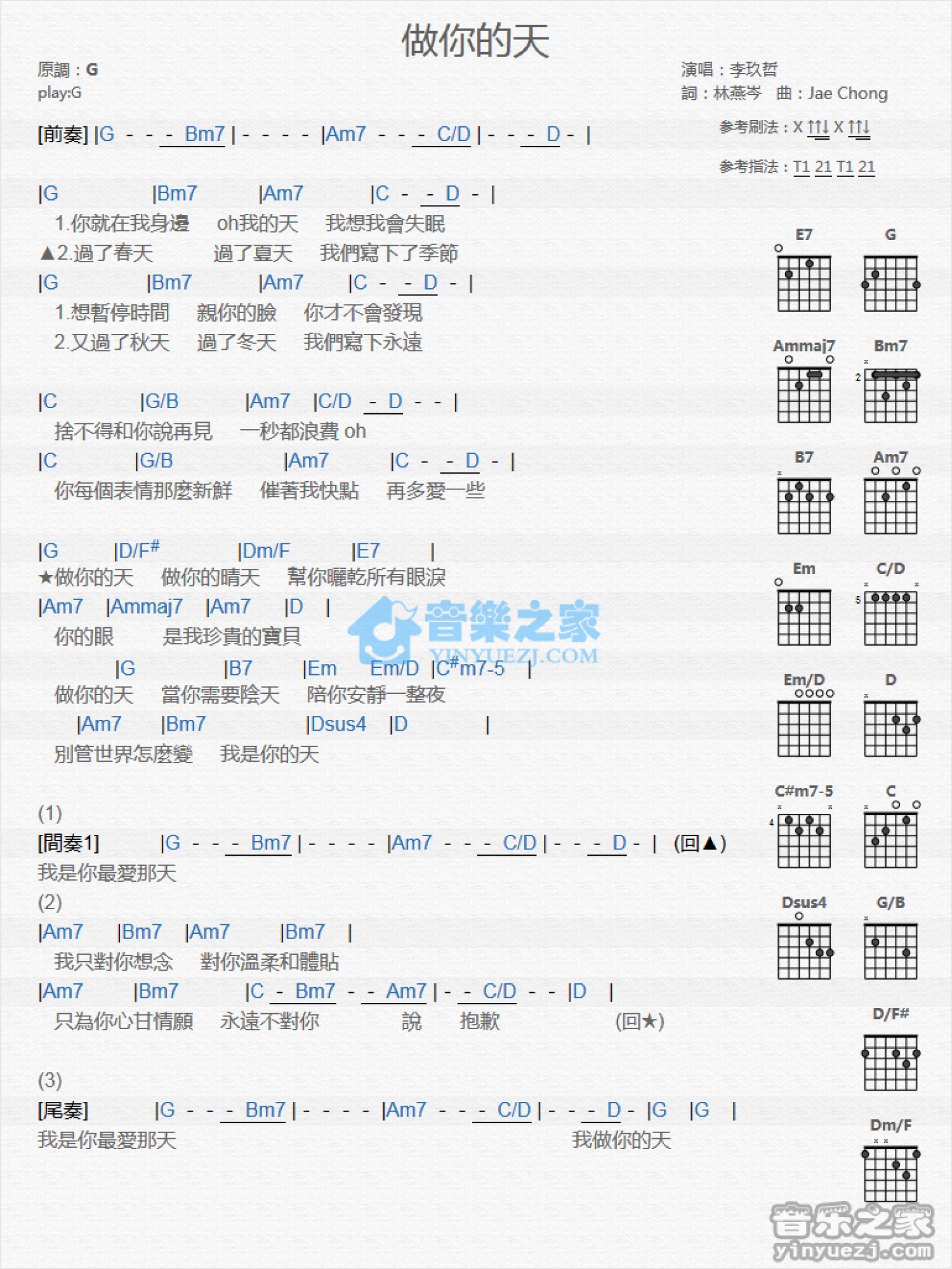 曲谱介绍: G调版 李玖哲《做你的天》吉他和弦弹唱谱