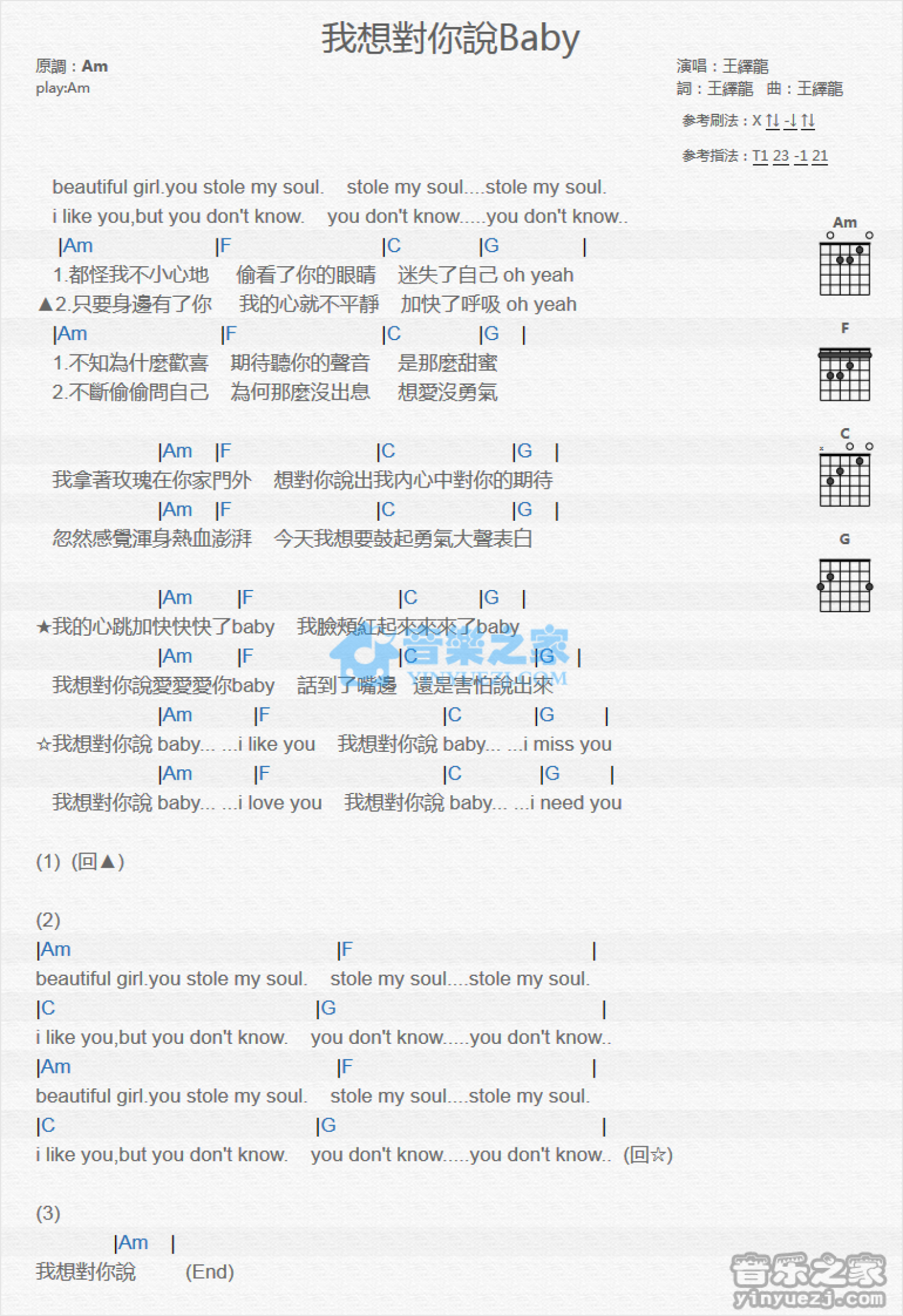 曲谱介绍: Am调版 王绎龙《我想对你说Baby》吉他和弦弹唱谱