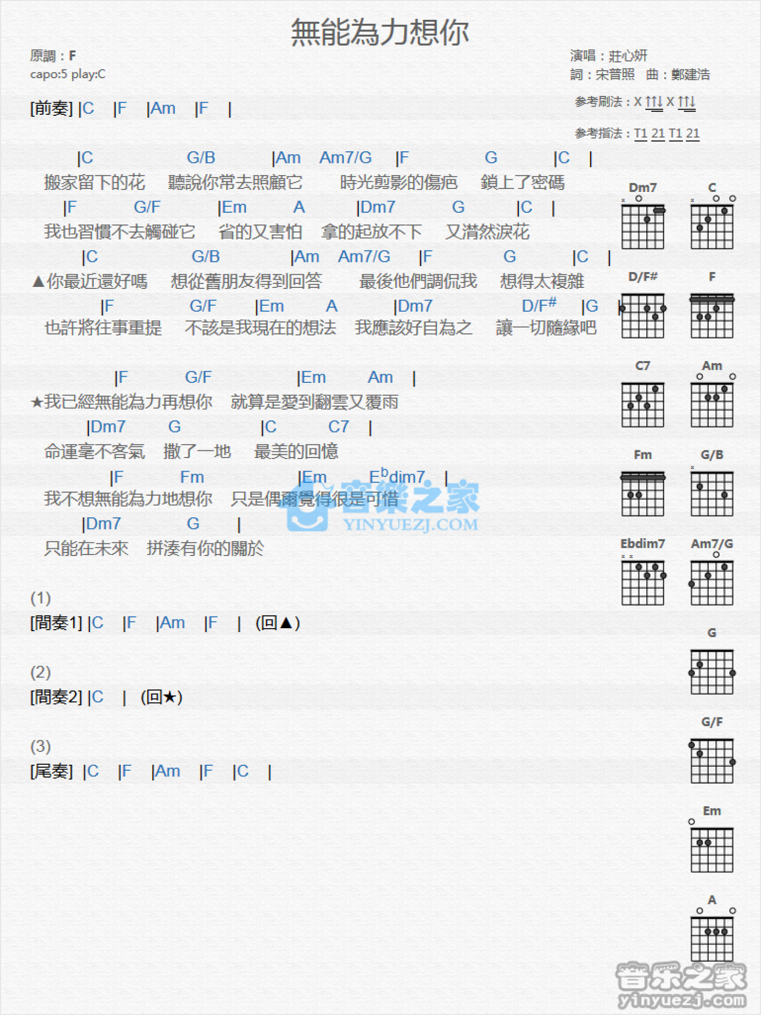 曲谱介绍: C调版《无能为力想你》吉他和弦弹唱谱