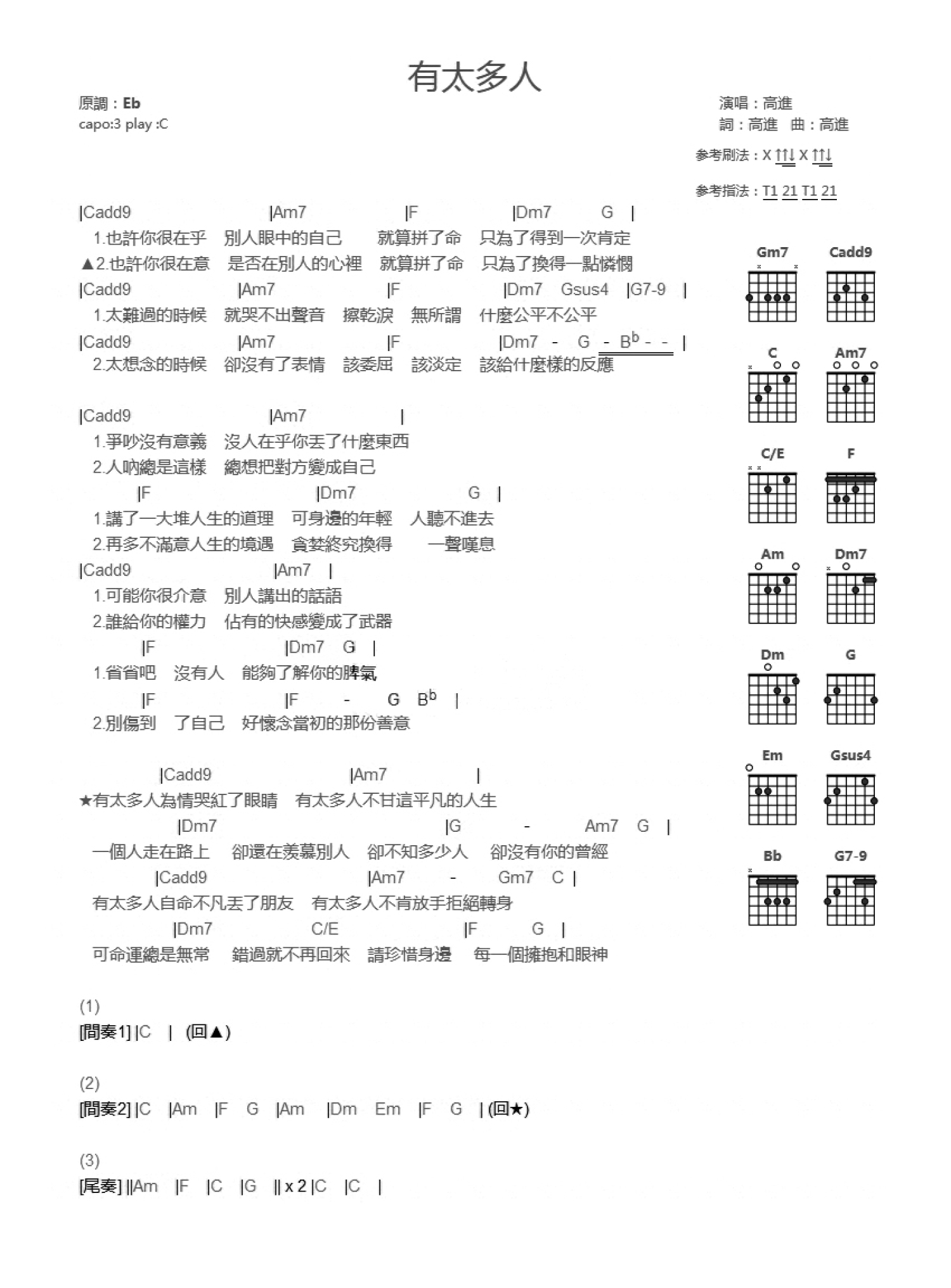 有太多人吉他谱 - 高进 - C调吉他弹唱谱 - 和弦谱