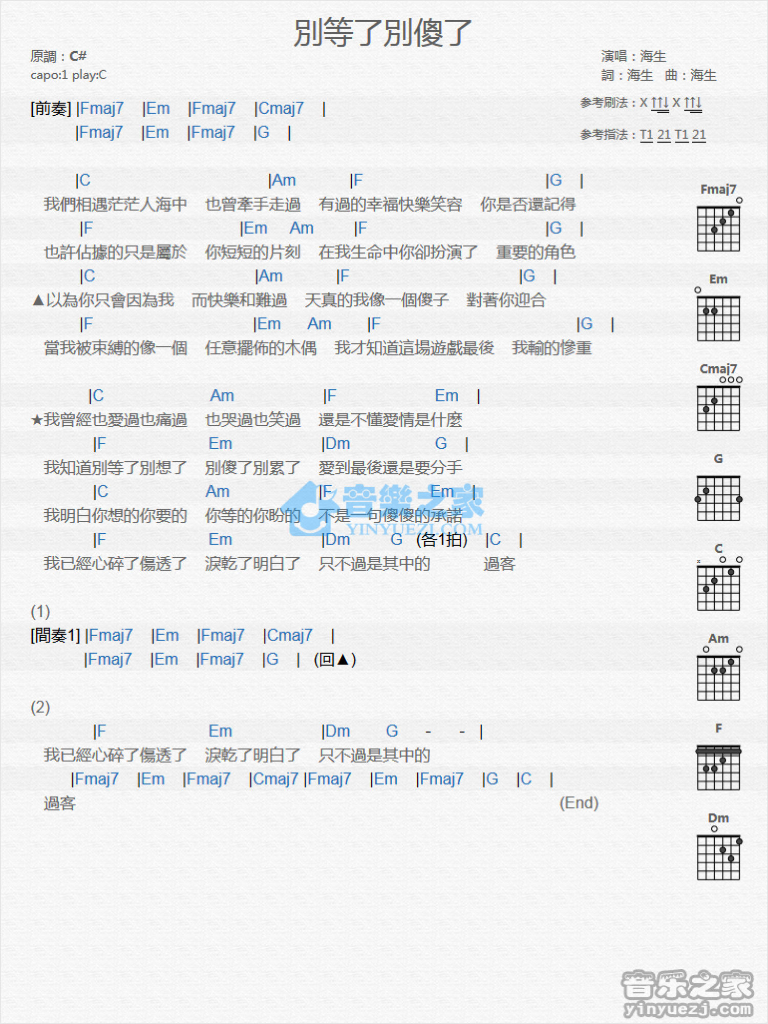 别等了别傻了吉他谱 - 海生 - C调吉他弹唱谱 - 和弦谱