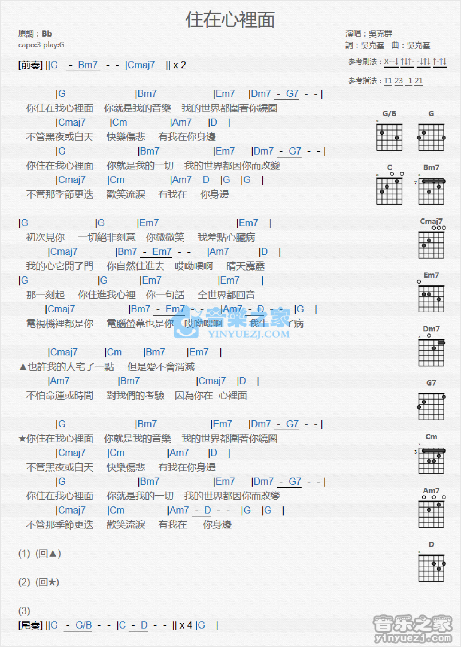 曲谱介绍: G调版 吴克t《住在心里面》吉他和弦弹唱谱