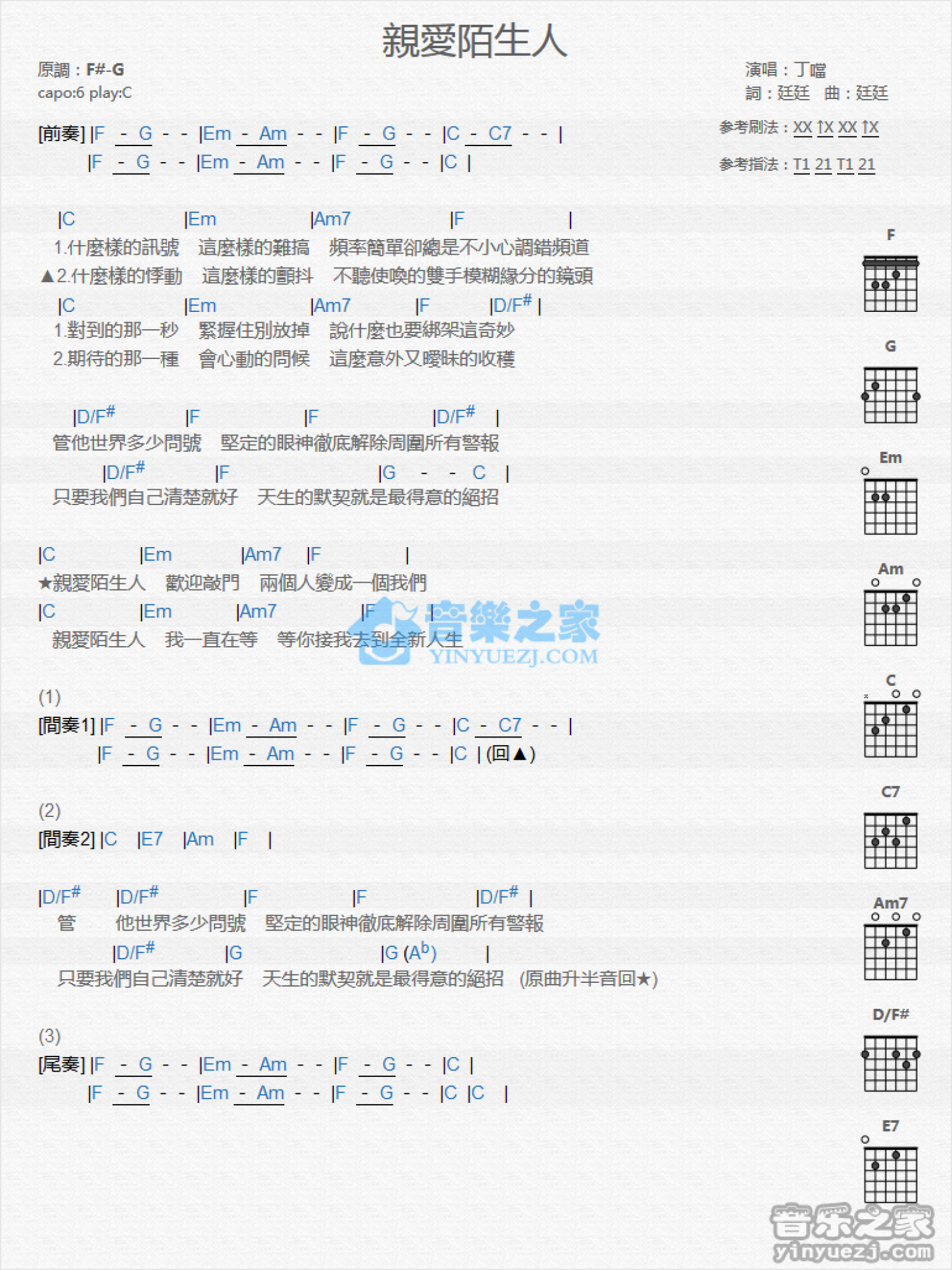 曲谱介绍: C调版丁当《亲爱陌生人》吉他和弦弹唱谱