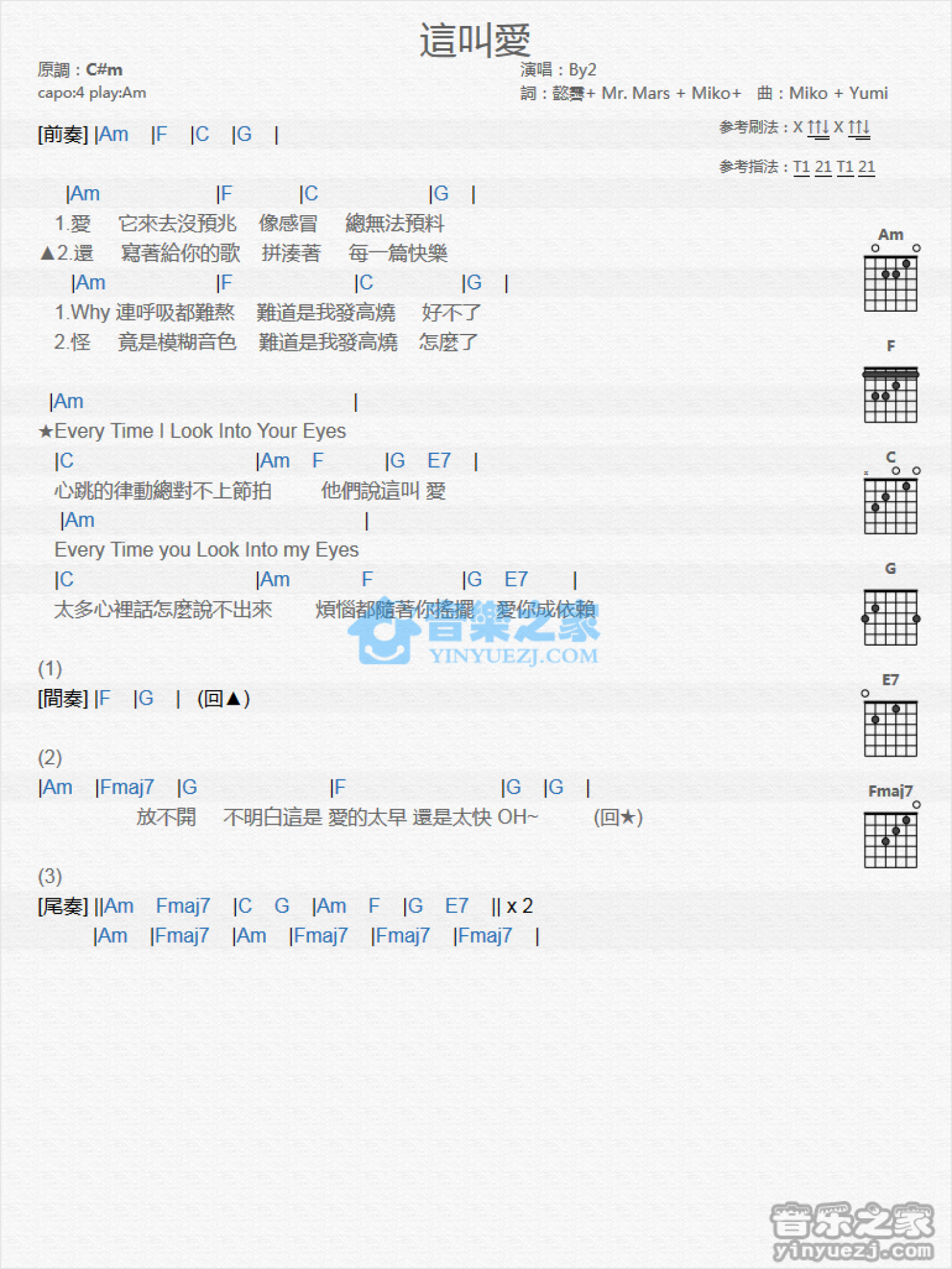 曲谱介绍: Am调版 By2《这叫爱》吉他和弦弹唱谱