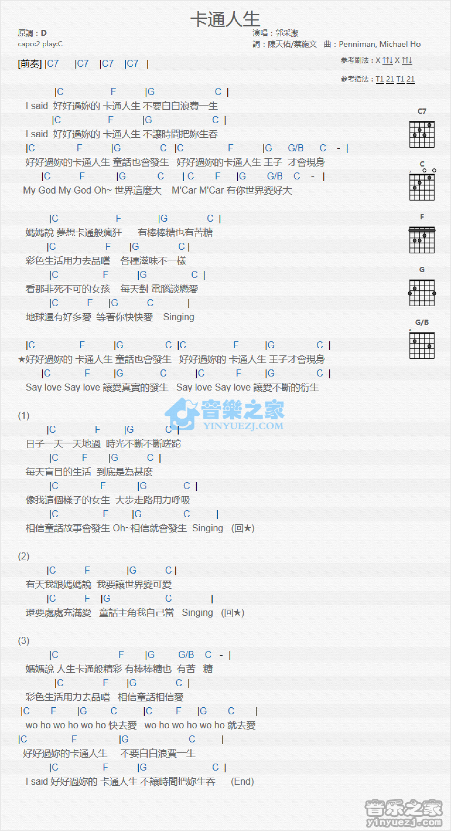 曲谱介绍: C调版 郭采洁《卡通人生》吉他和弦弹唱谱