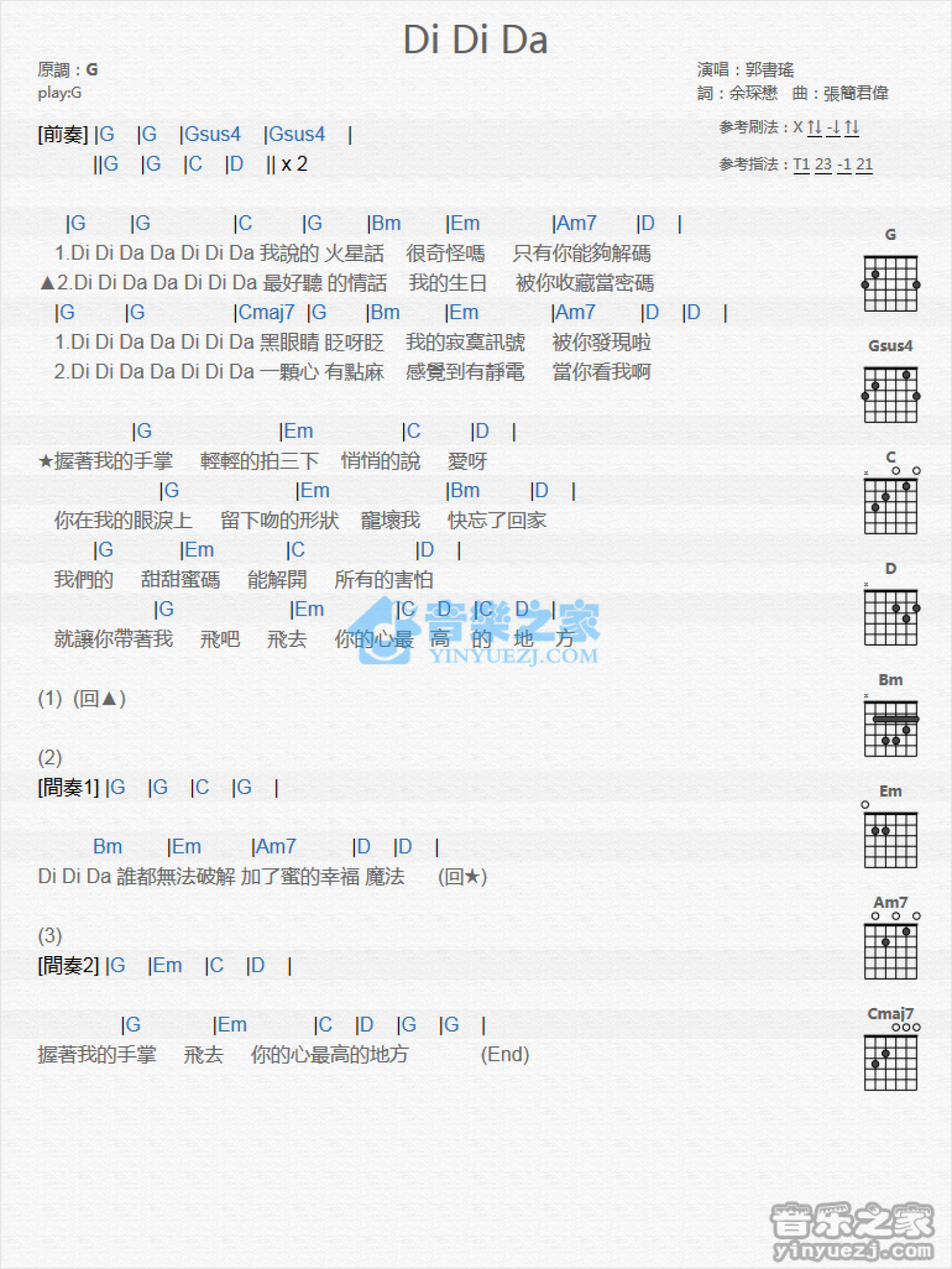 曲谱介绍: G调版 郭书瑶《Di Di Da》吉他和弦弹唱谱