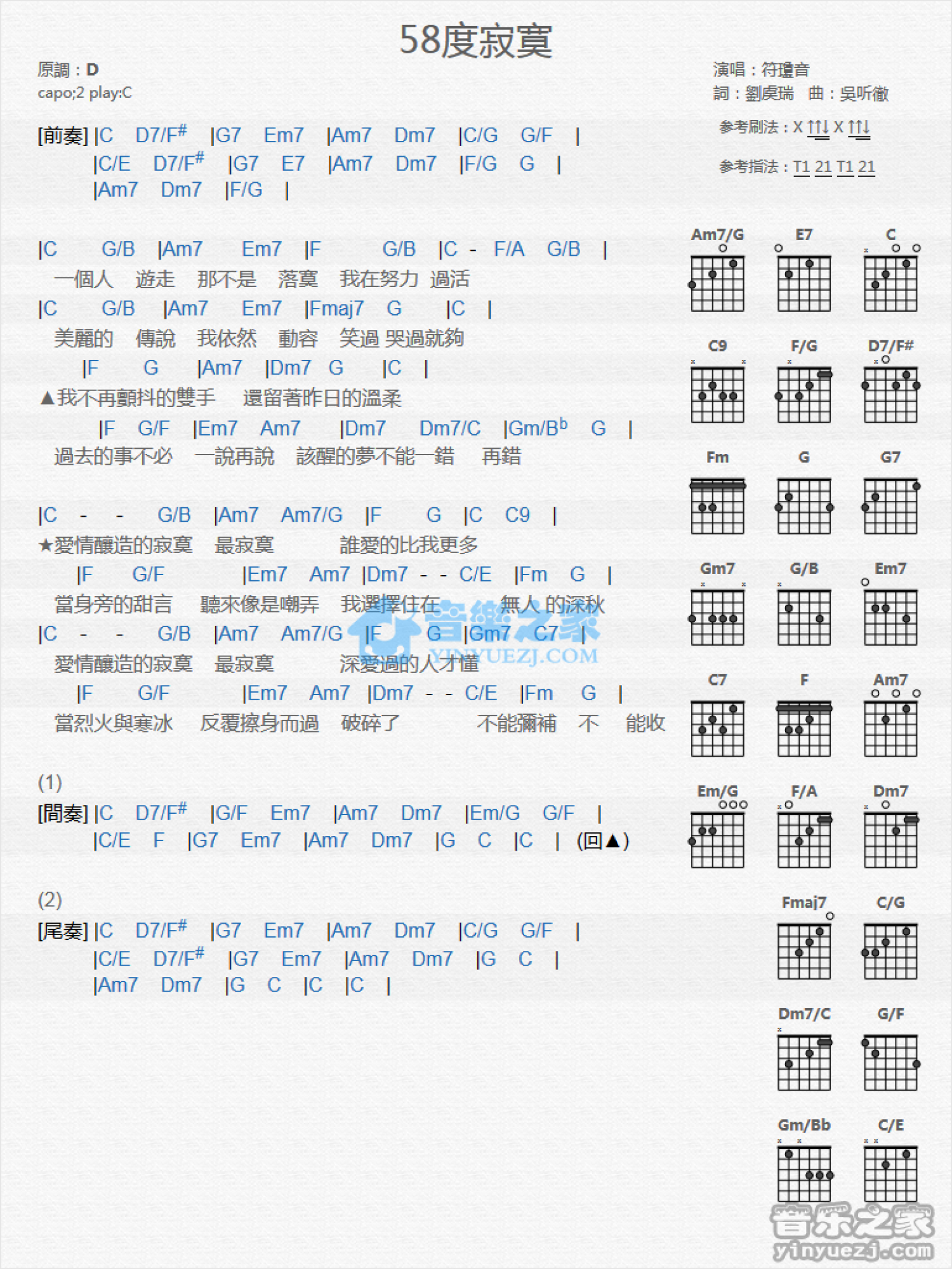 曲谱介绍: C调版 符琼音《58度寂寞》吉他和弦弹唱谱