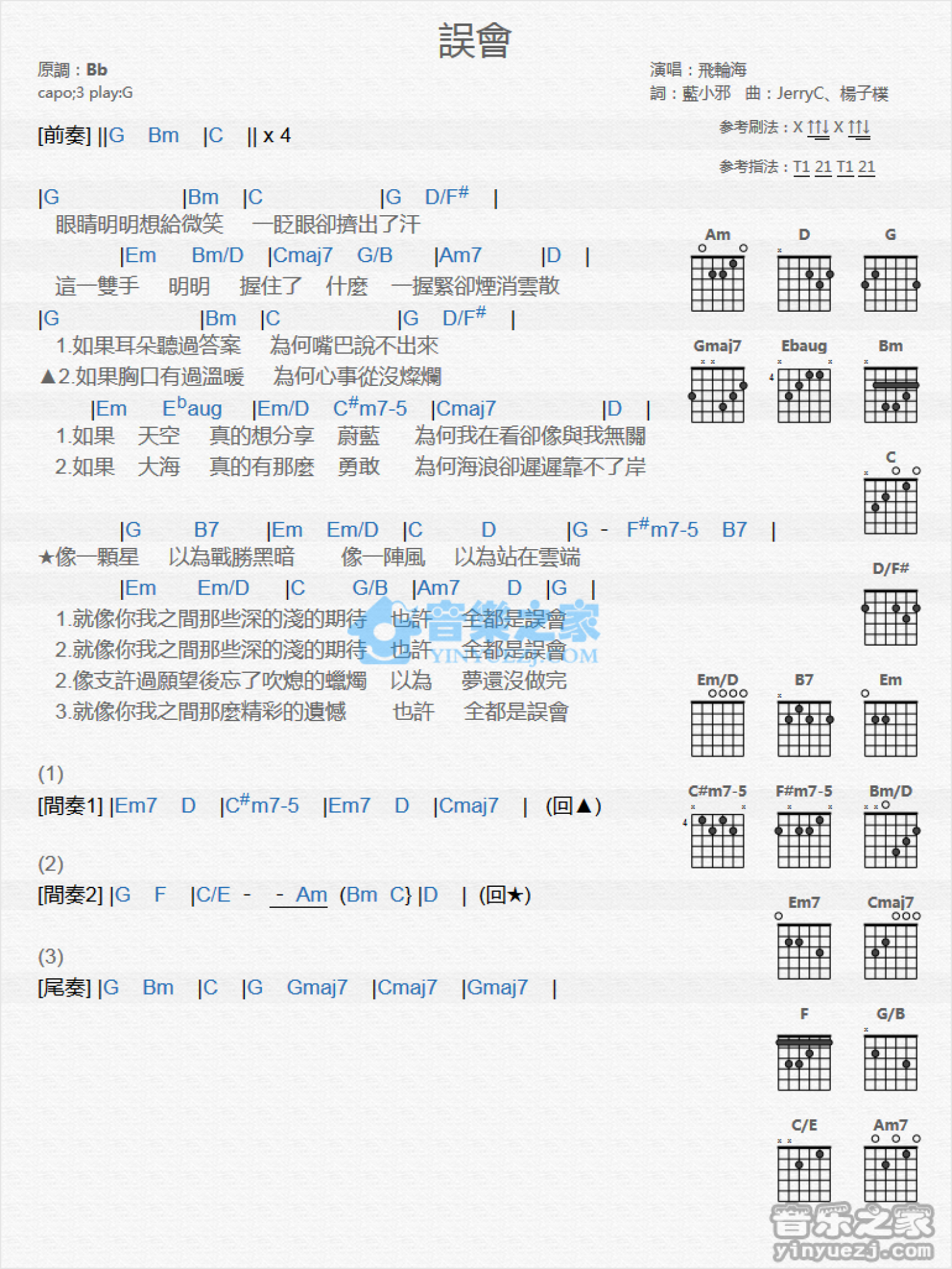 曲谱介绍: G调版 飞轮海《误会》吉他和弦弹唱谱