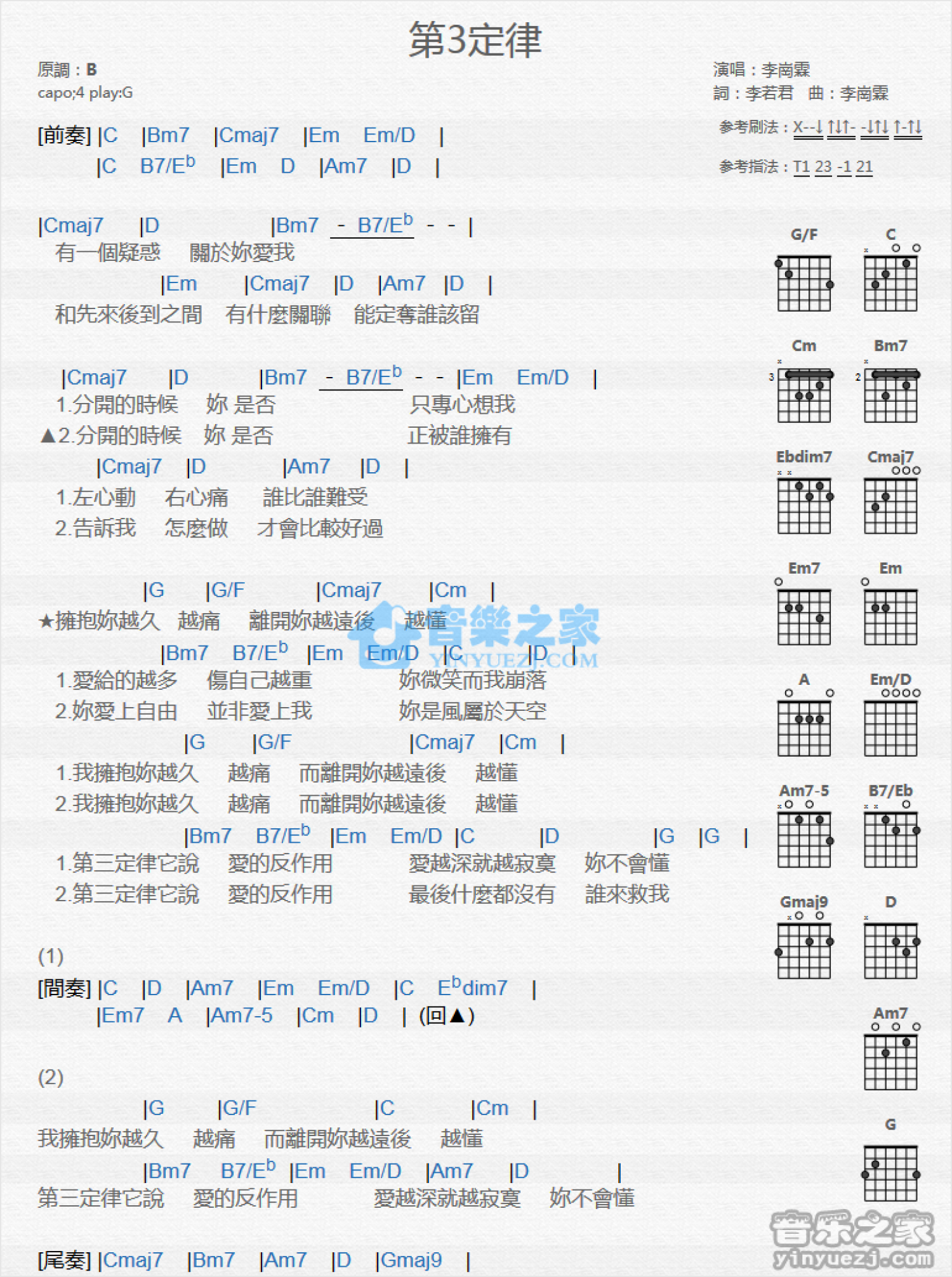 曲谱介绍: G调版 李岗霖《第3定律》吉他和弦弹唱谱