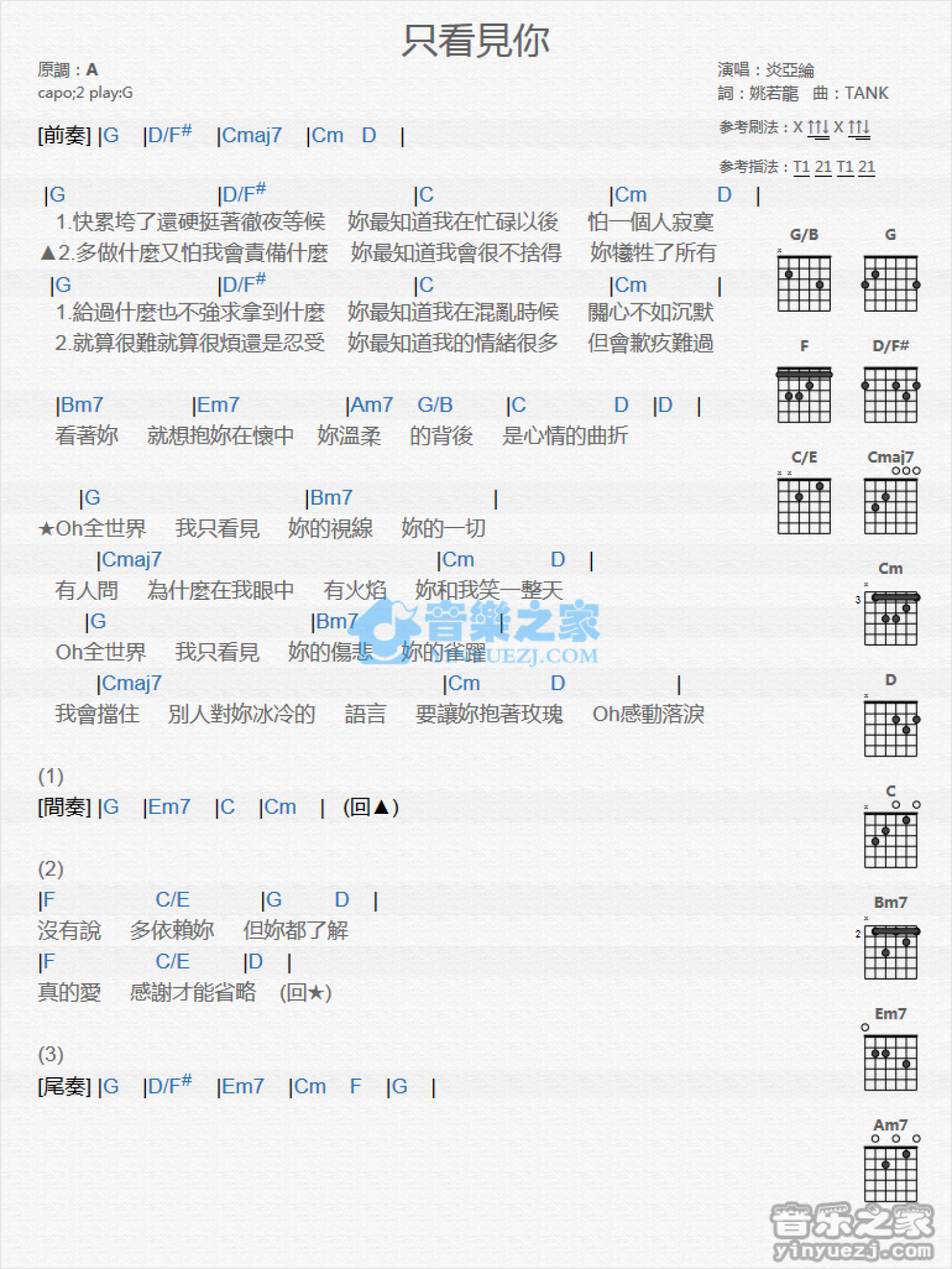 曲谱介绍: G调版《只看见你》吉他和弦弹唱谱