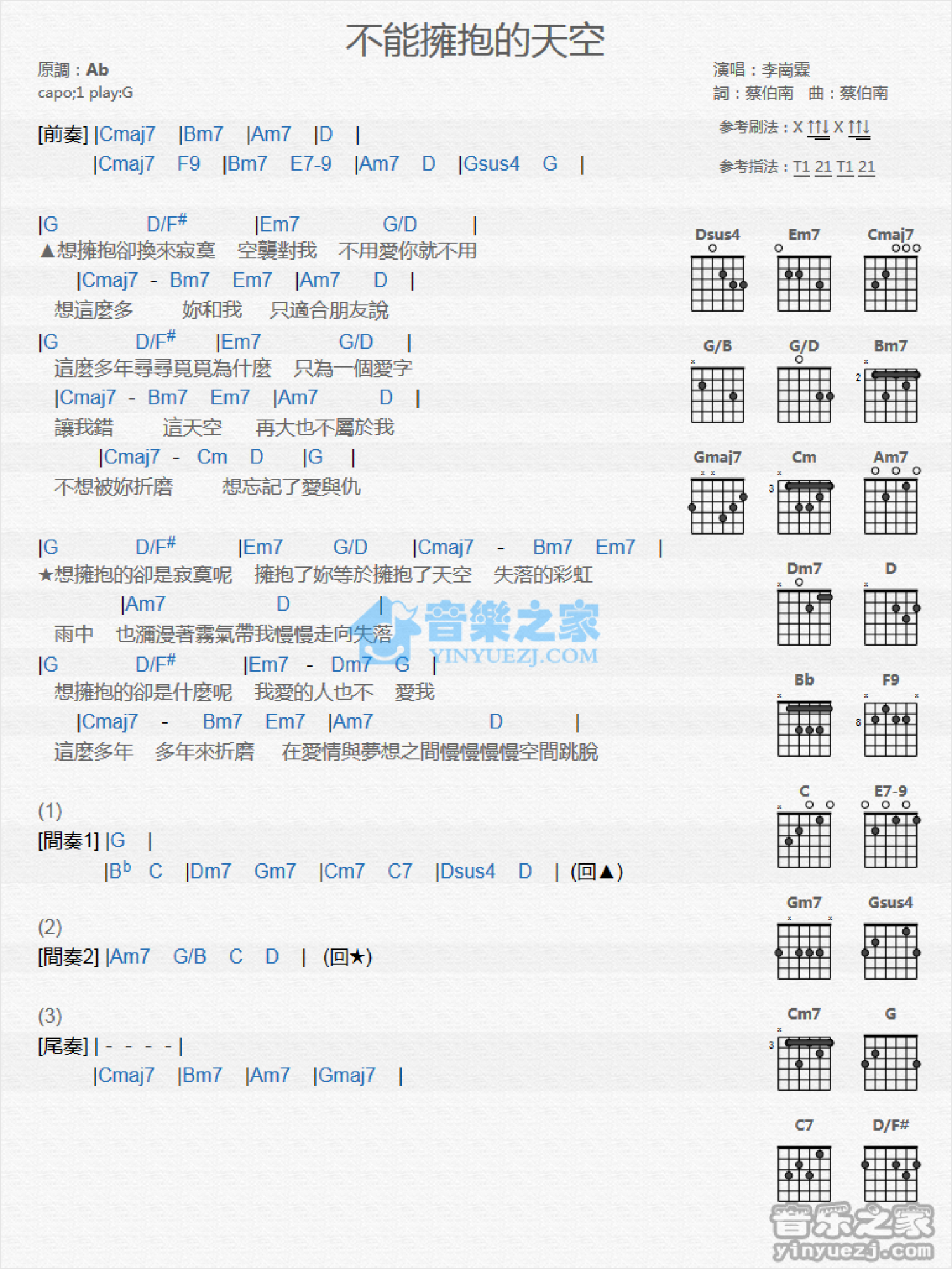 曲谱介绍: G调版 李岗霖《不能拥抱的天空》吉他和弦弹唱谱