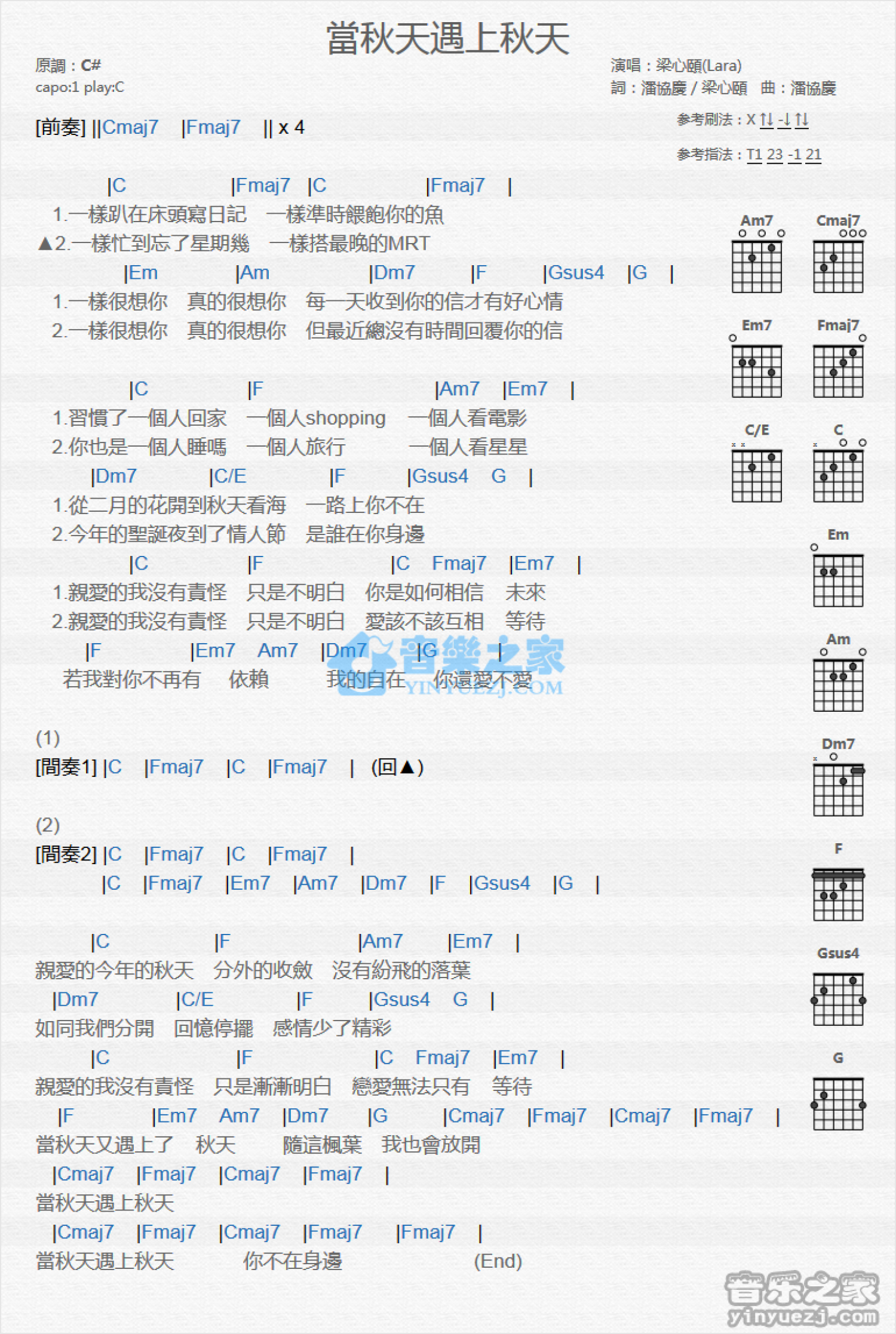 曲谱介绍: C调版 梁心颐《当秋天遇上秋天》吉他和弦弹唱谱