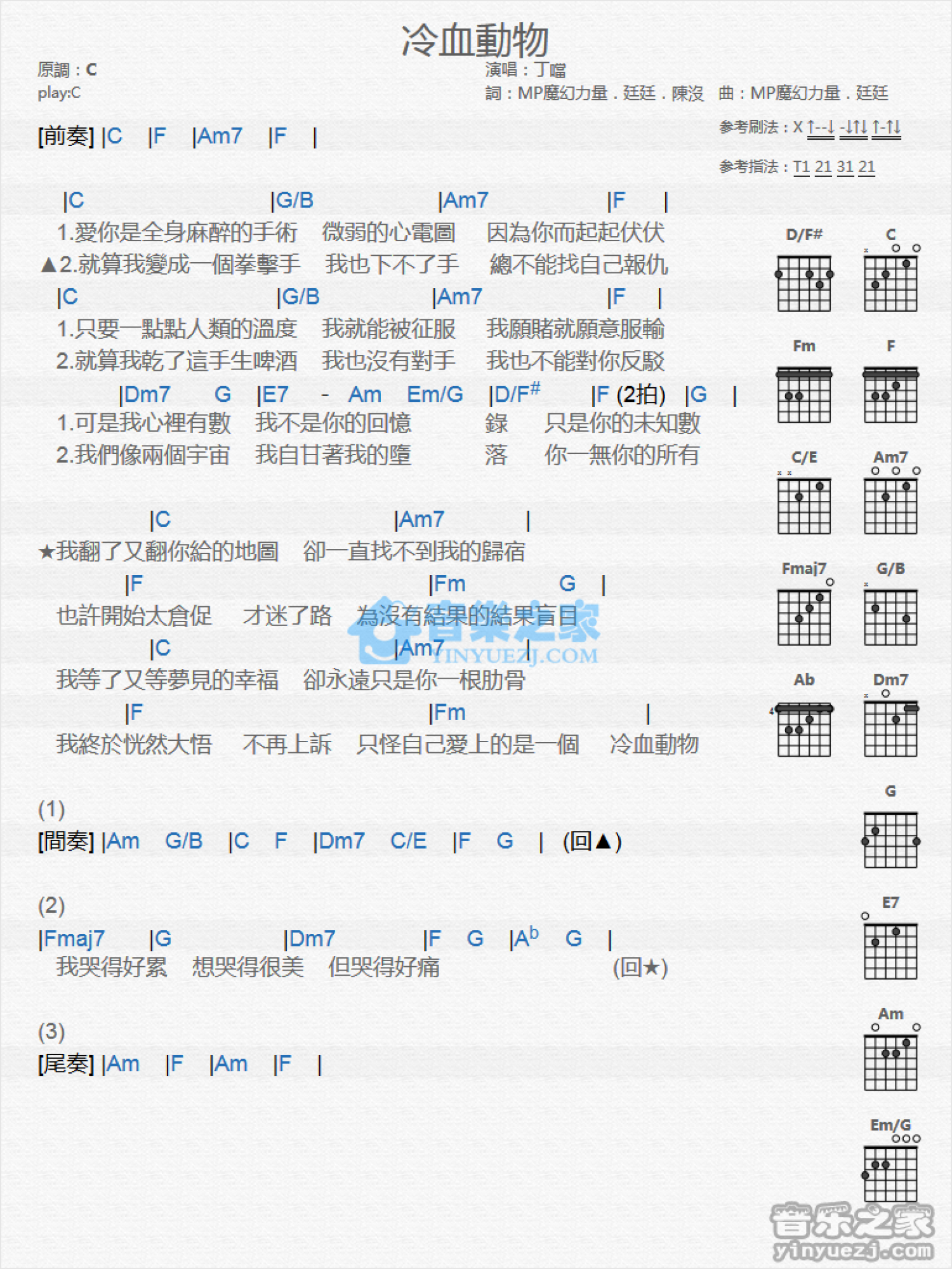 曲谱介绍: C调版 丁当《冷血动物》吉他和弦弹唱谱