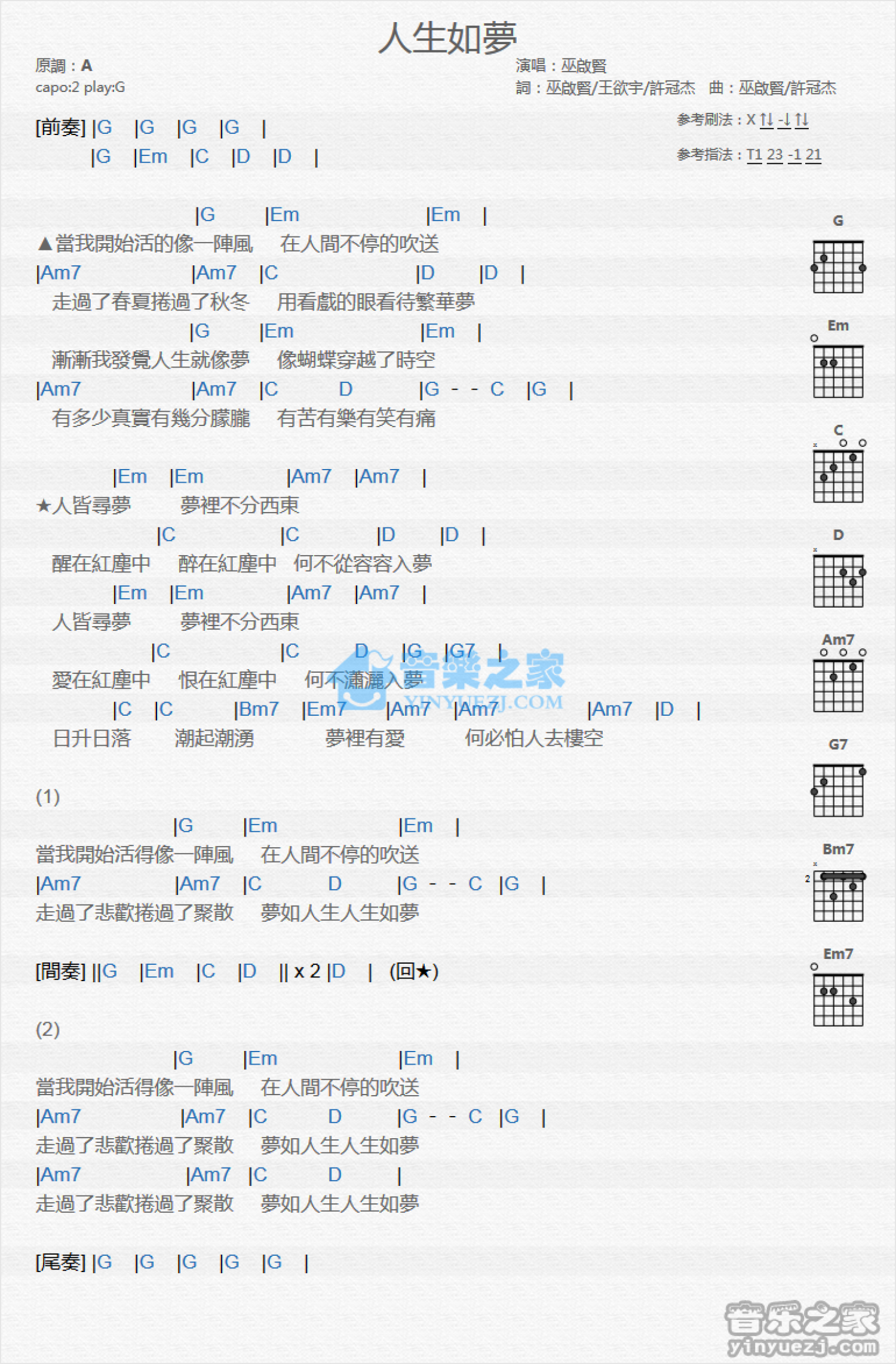 曲谱介绍: G调版 巫启贤《人生如梦》吉他和弦弹唱谱