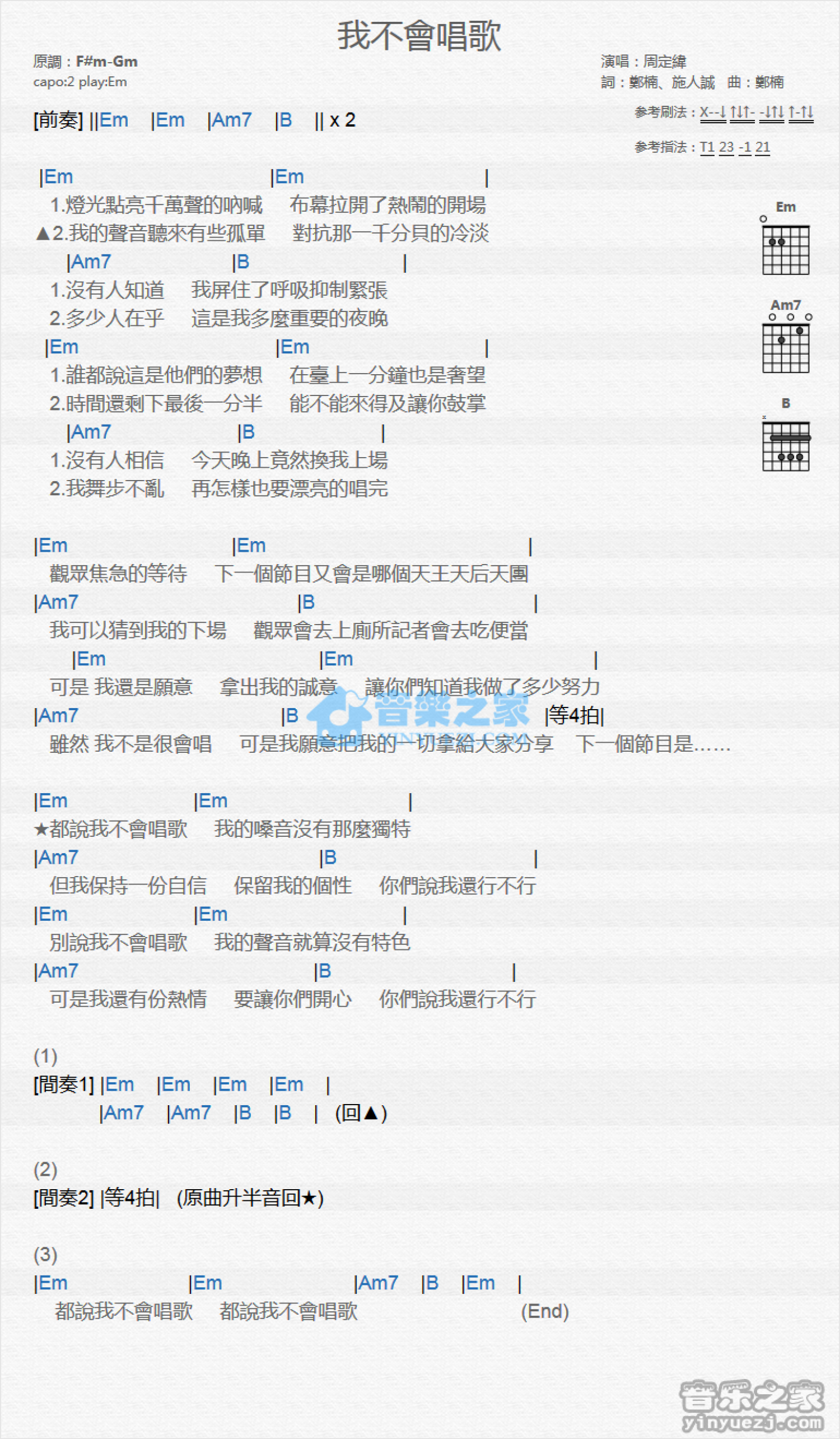 曲谱介绍: Em调版 周定纬《我不会唱歌》吉他和弦弹唱谱