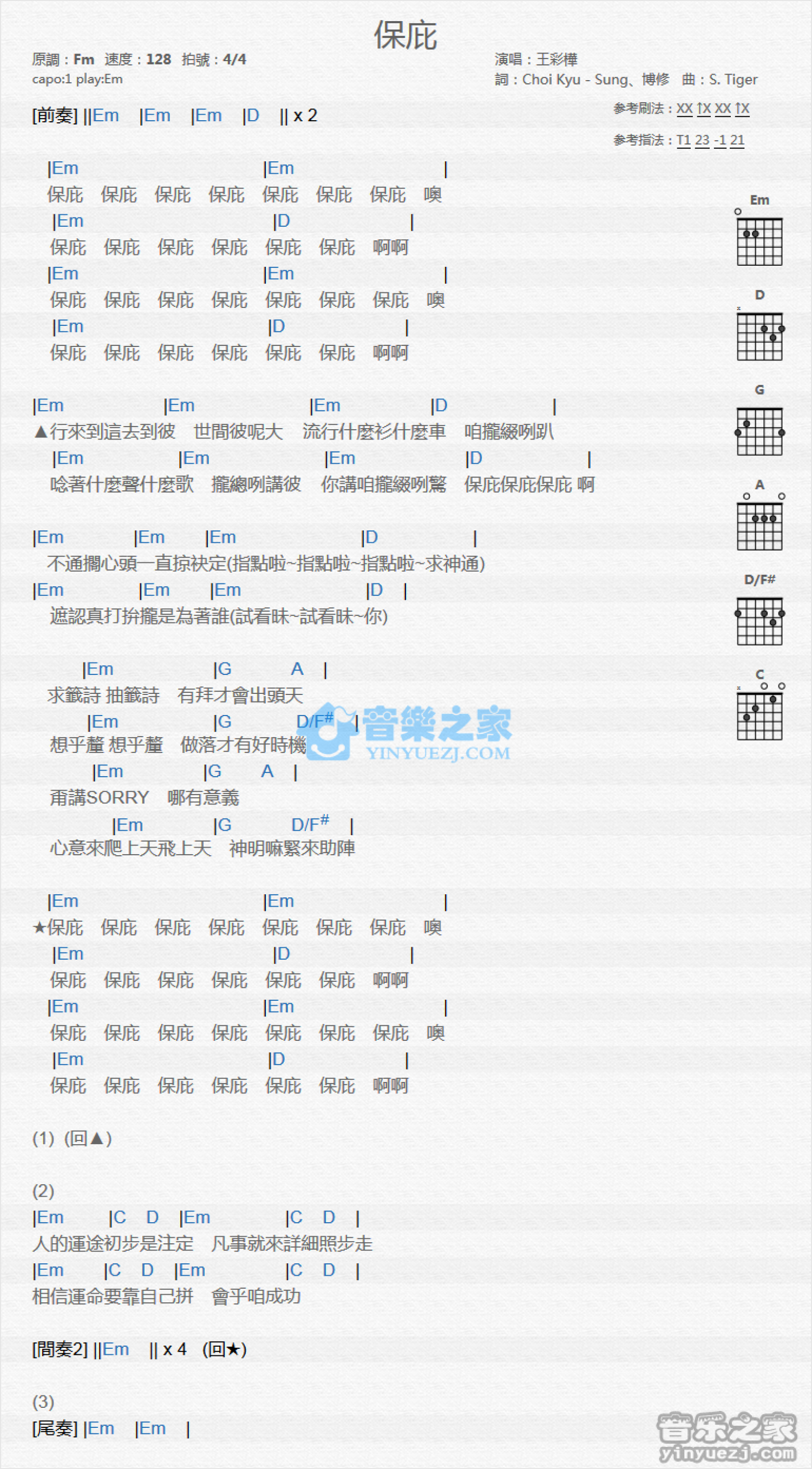 曲谱介绍: Em调版 王彩桦《包庇》吉他和弦弹唱谱
