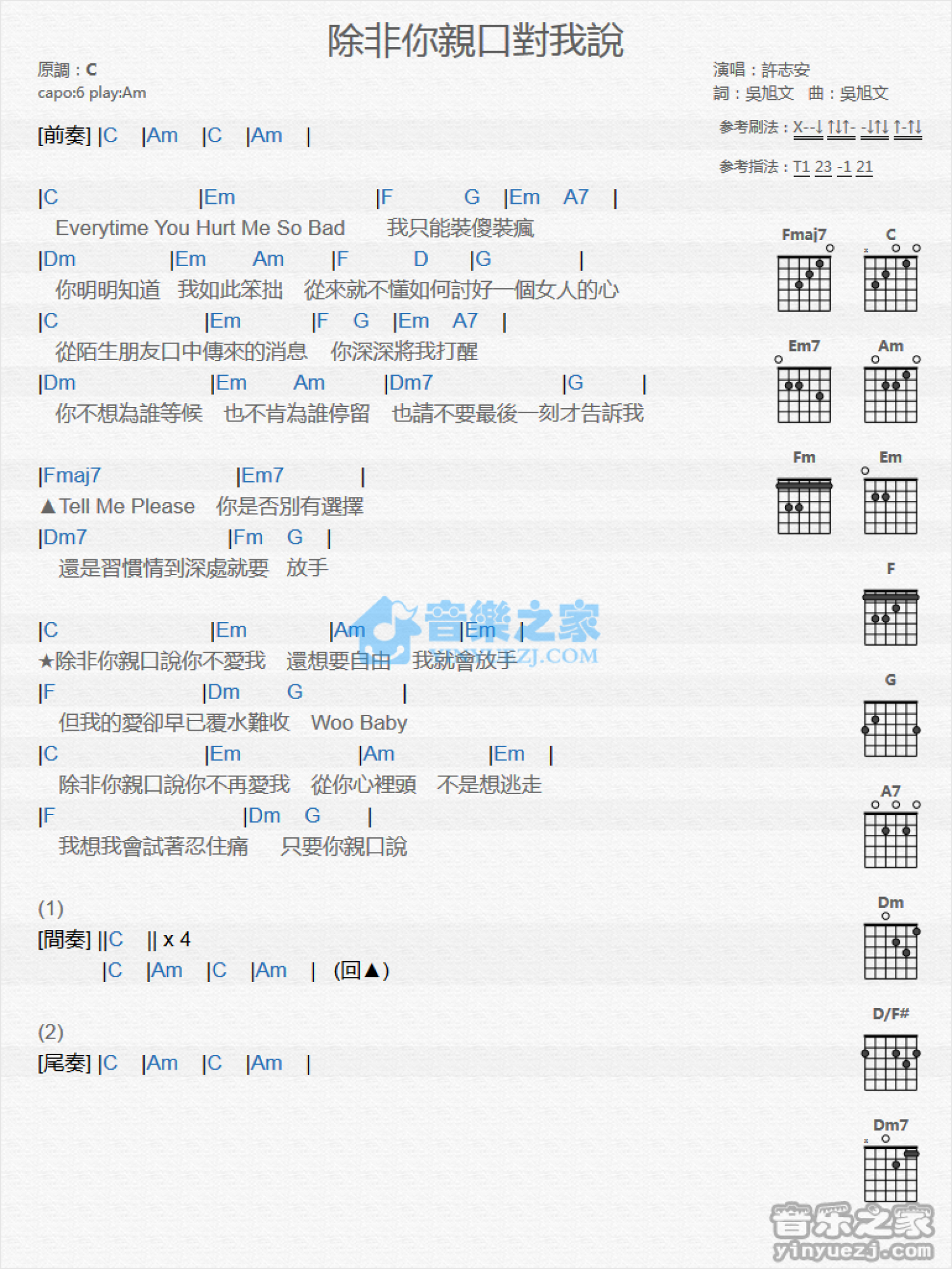 曲谱介绍: Am调版 许志安《除非你亲口对我说》吉他和弦弹唱谱