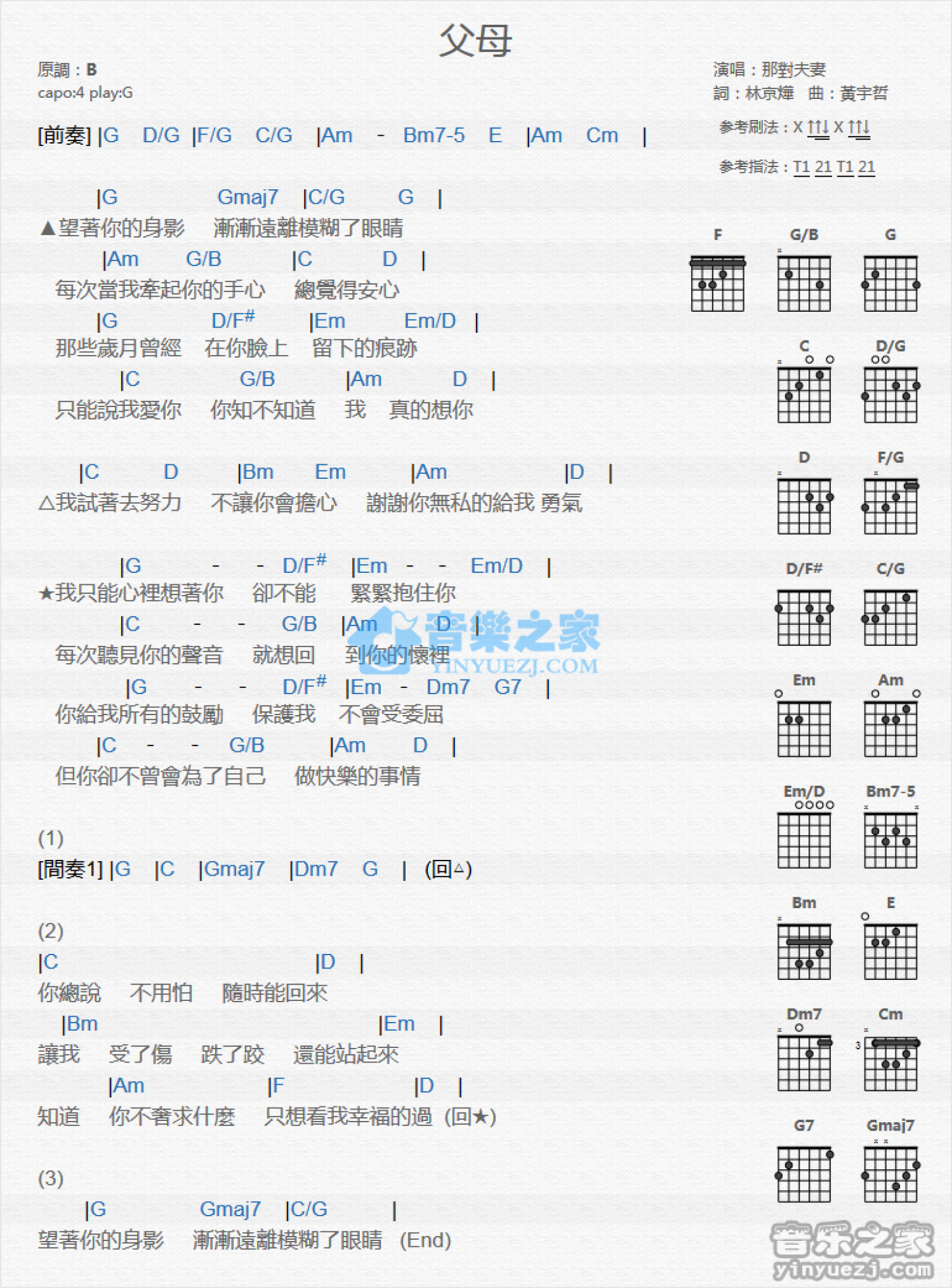 曲谱介绍: G调版 那对父母《夫妻》吉他和弦弹唱谱