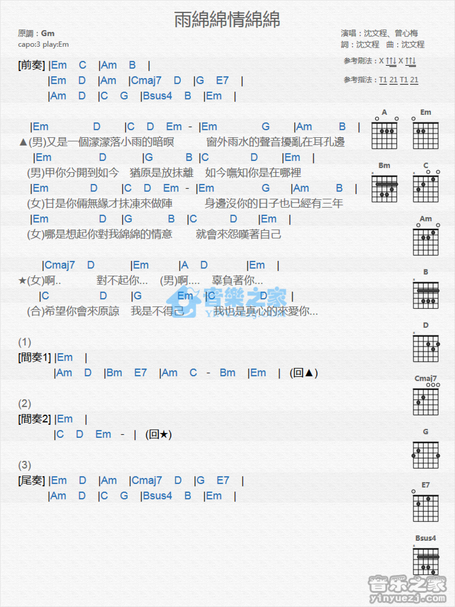 曲谱介绍: Em调版 沈文程/曾心梅《雨绵绵情绵绵》吉他和弦弹唱谱