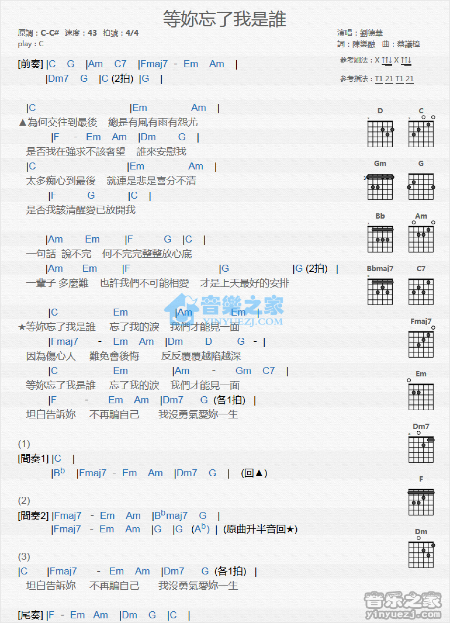 曲谱介绍: C调版 刘德华《等你忘了我是谁》吉他和弦弹唱谱