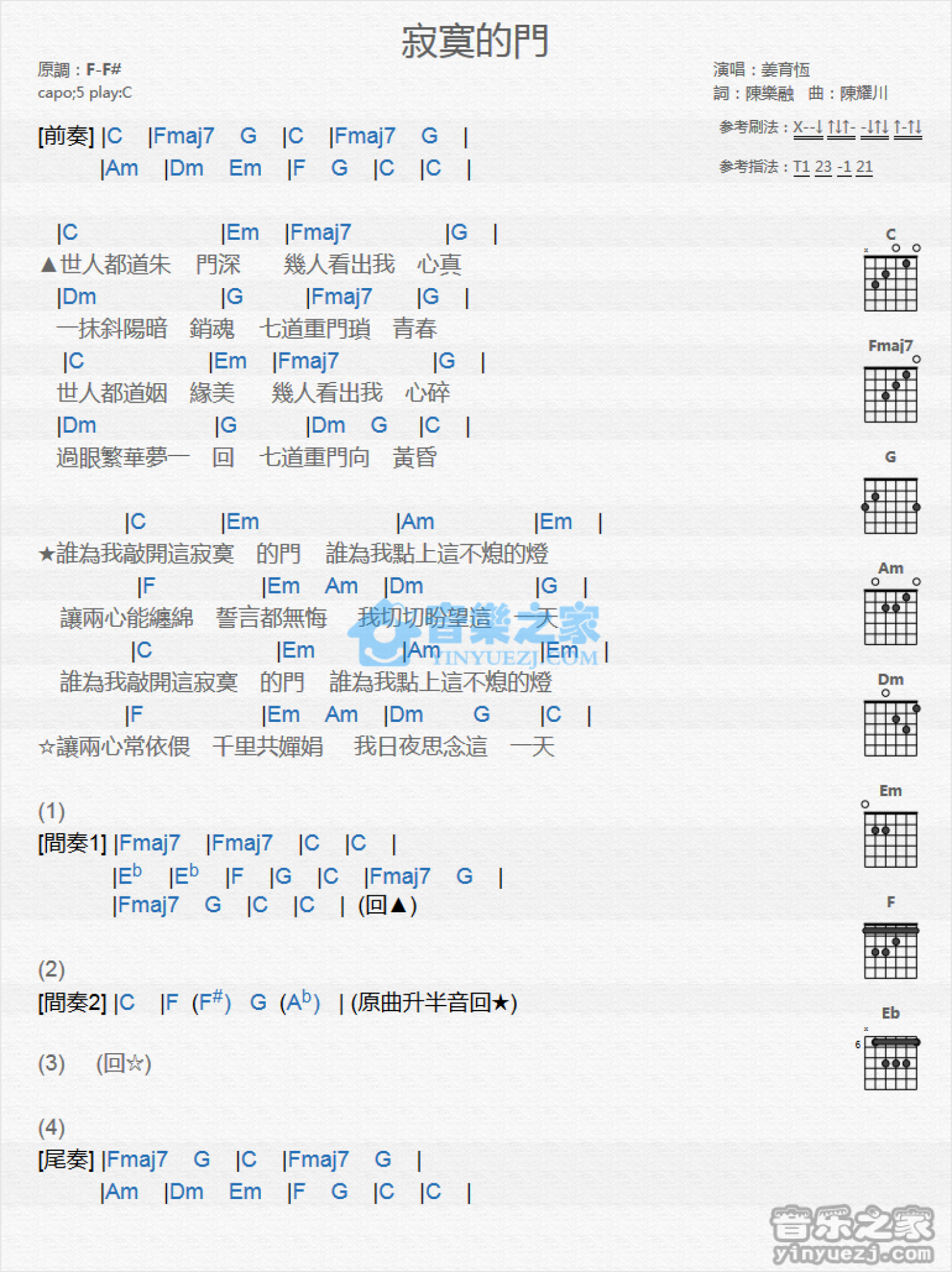 曲谱介绍: C调版 姜育恒《寂寞的门》吉他和弦弹唱谱