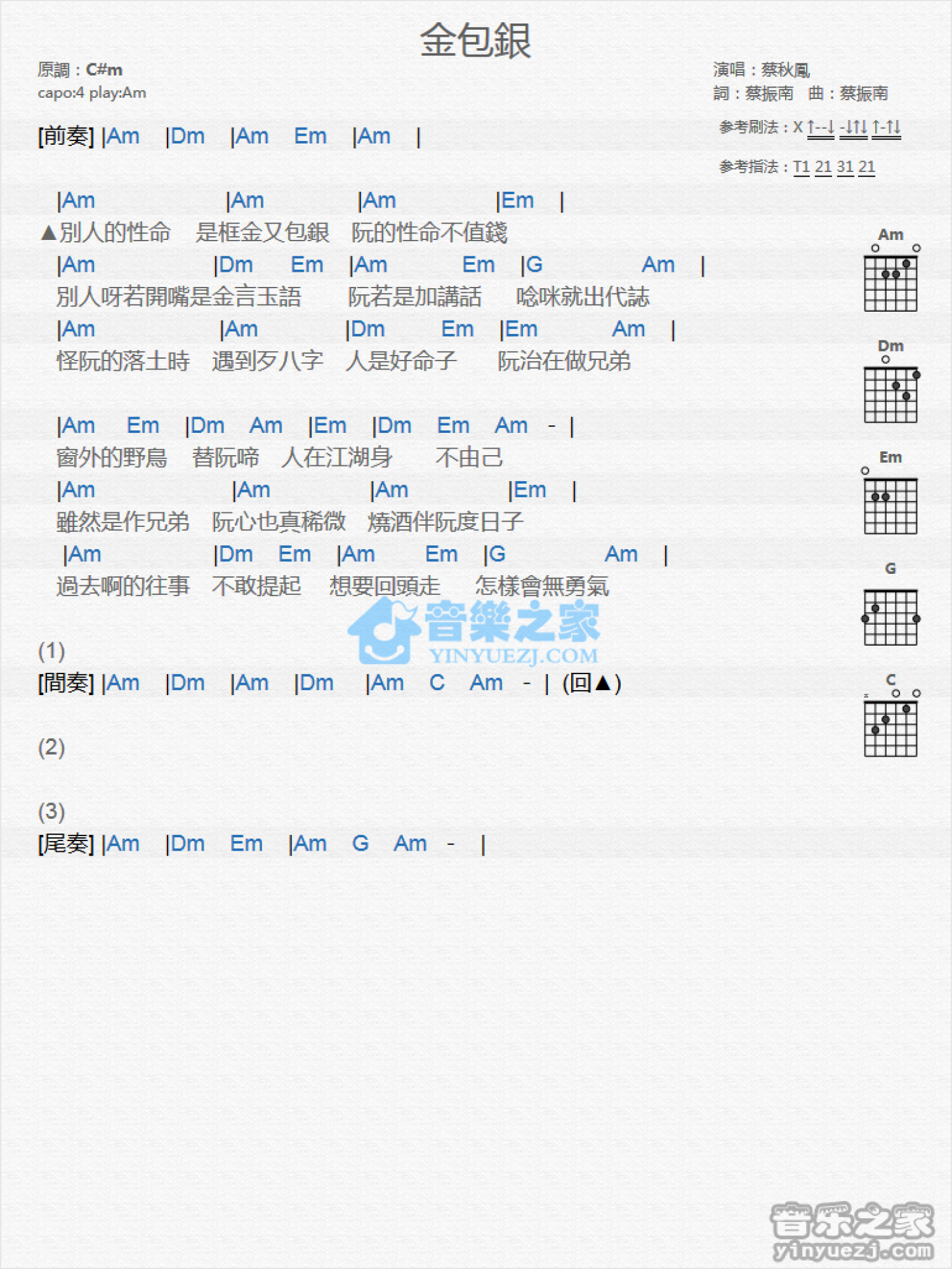 曲谱介绍: Am调版 蔡秋凤《金包银》吉他和弦弹唱谱